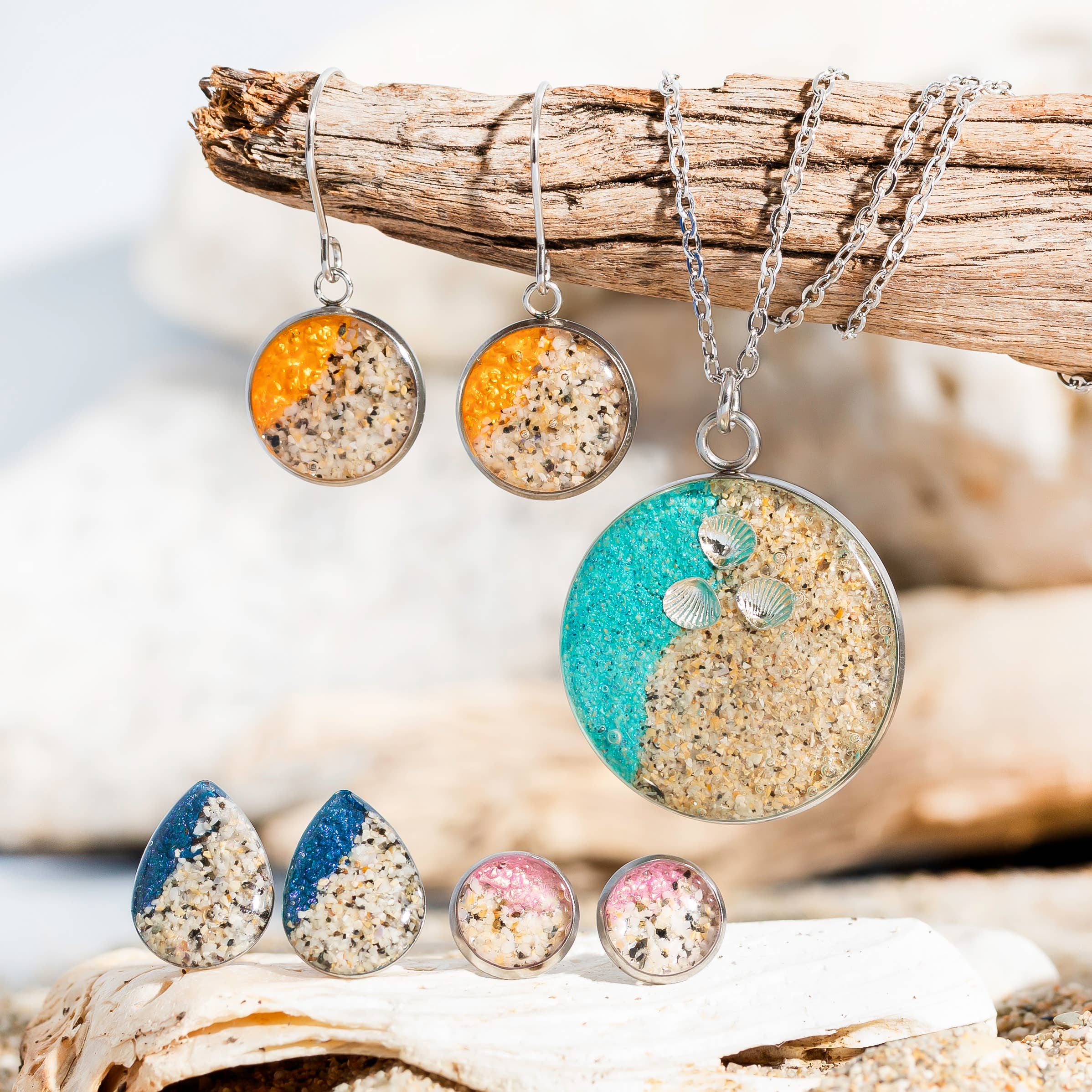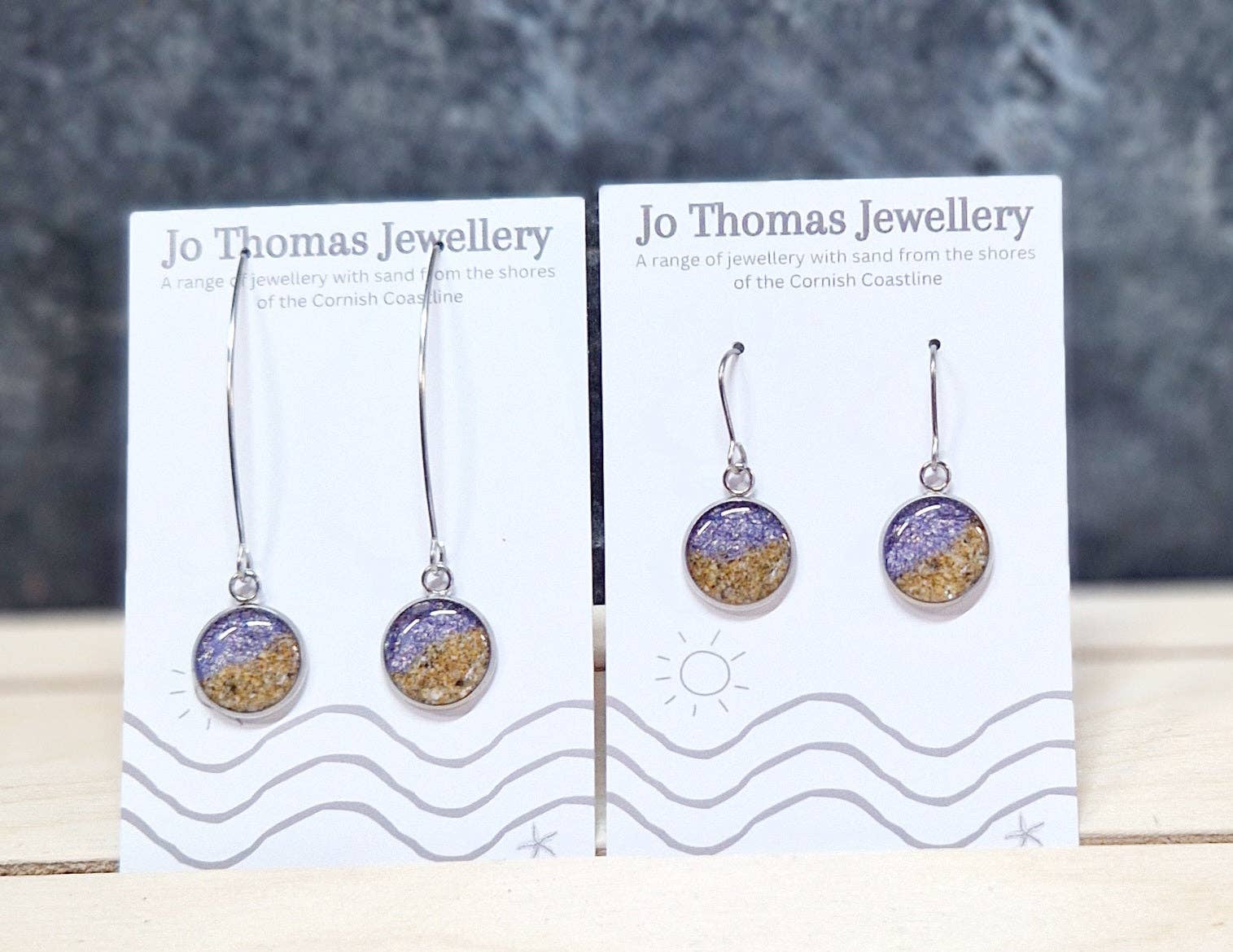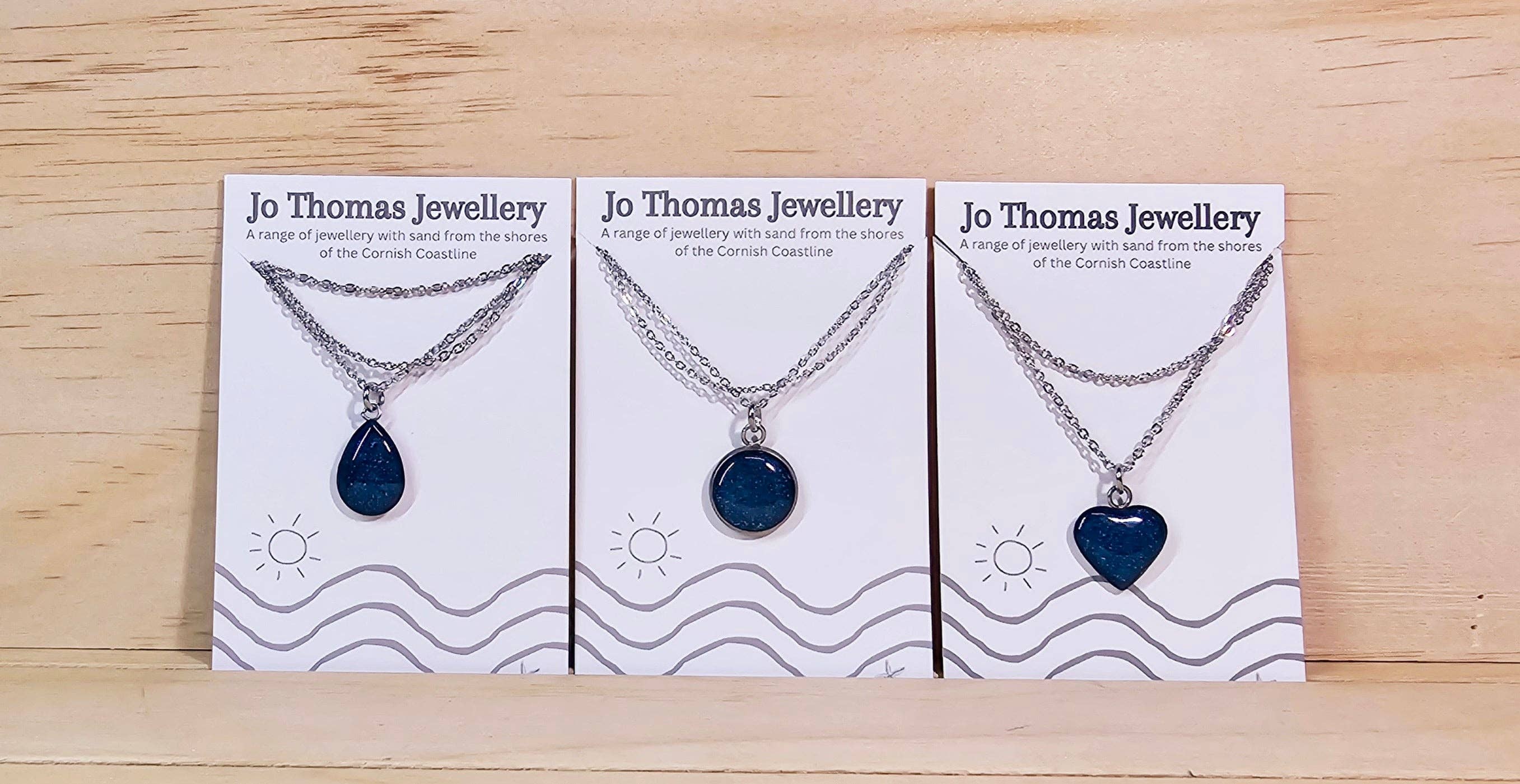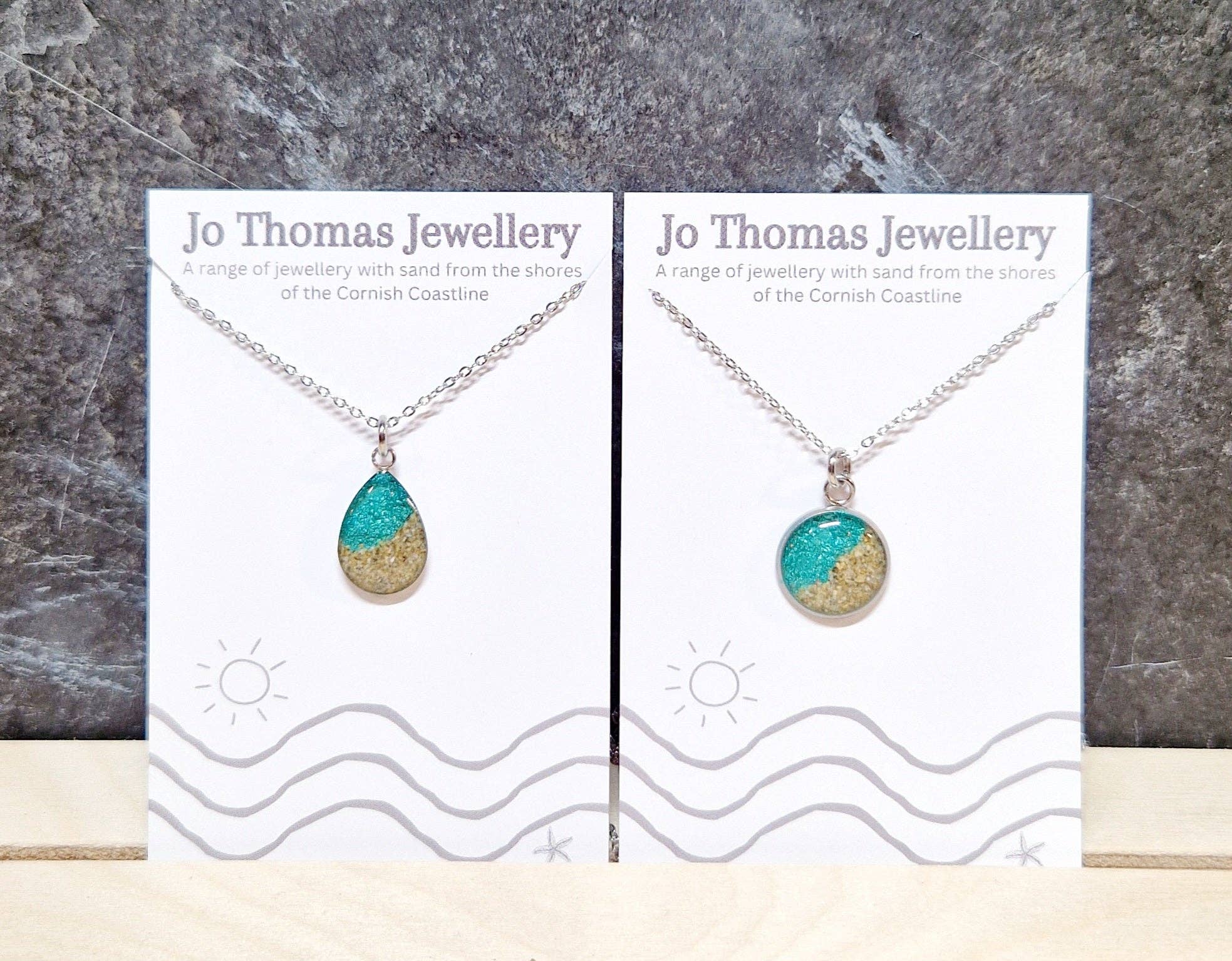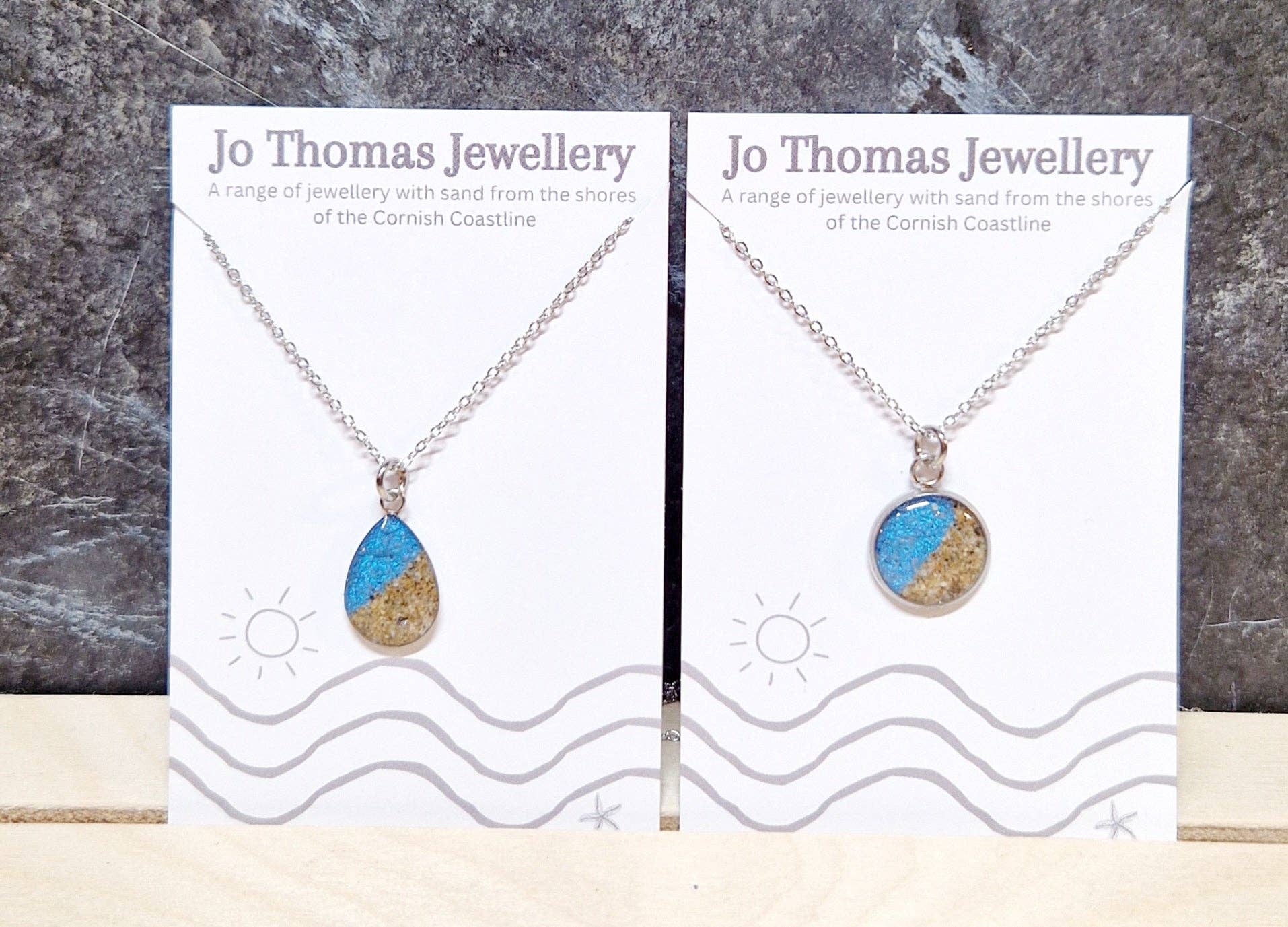 Mi chiamo Jo Thomas. Lavorando nel mio studio a Falmouth, In Cornovaglia, disegno e realizzo bellissimi gioielli contemporanei in resina utilizzando una gamma di montature cabochon in acciaio inossidabile, lavorando con sabbia proveniente dalla costa della Cornovaglia, aggiungendo colori e ciondoli per creare questa gamma unica di gioielli fortemente ispirata ai favolosi paesaggi della Cornovaglia che mi circondano entrambi sulla costa e nella campagna. Molti temi sono presenti nelle mie collezioni, se c'è un design o un oggetto specifico vuoi che aggiunga, per favore mettiti in contatto. Se hai un negozio vicino alla spiaggia e desideri una gamma di souvenir con il tuo logo sui tuoi biglietti da visita, contattami.
