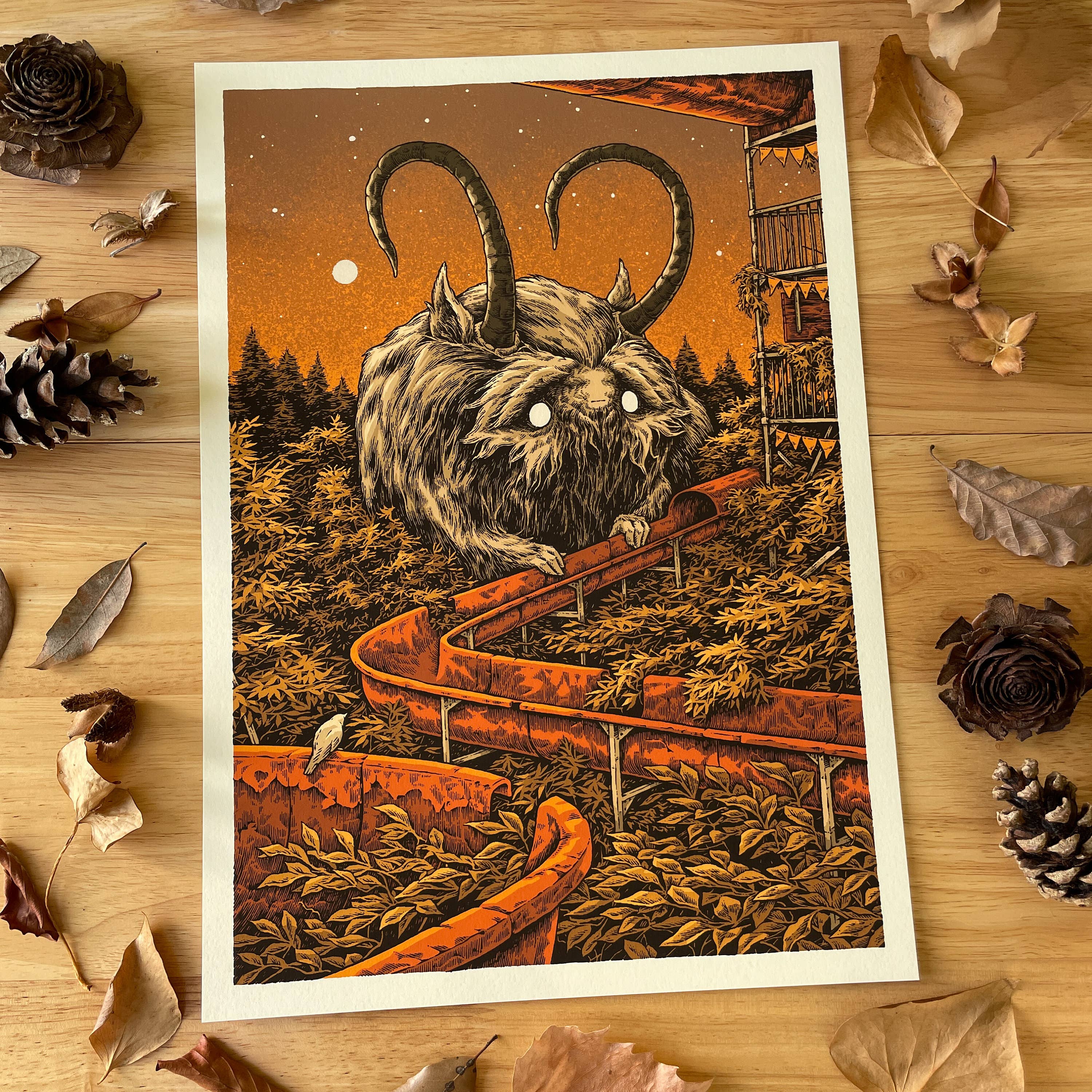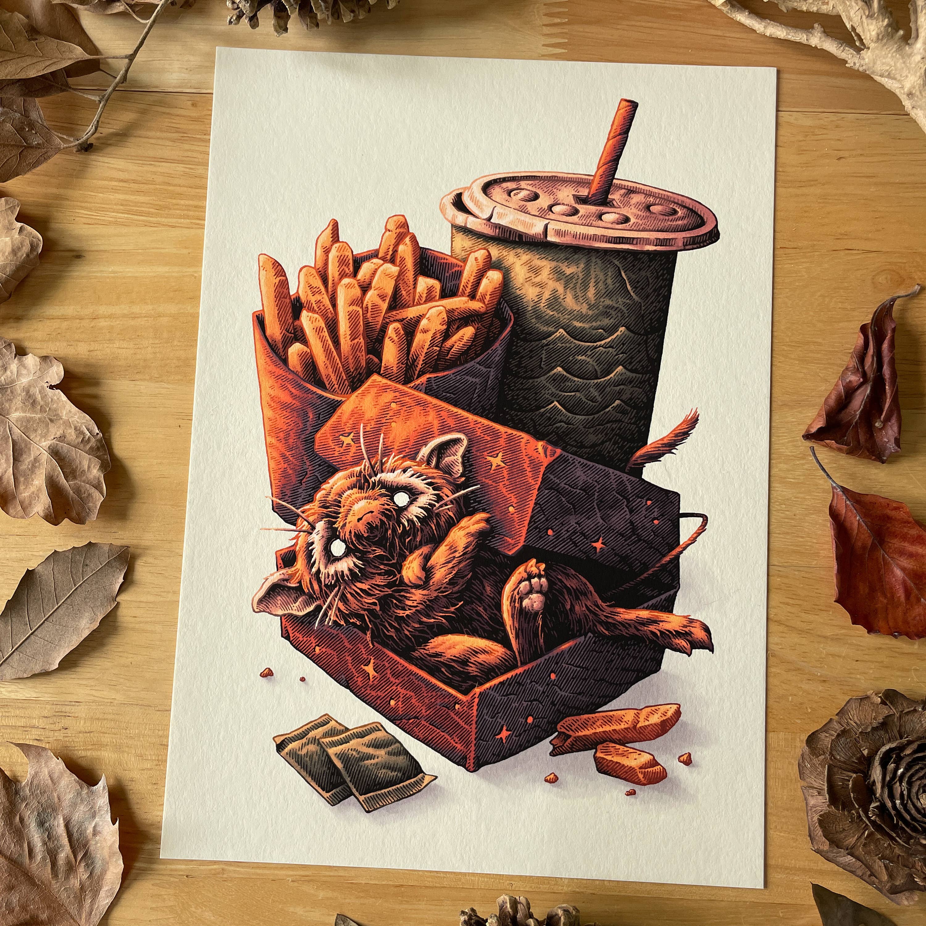 Ciao, sono Simon e creo un mondo familiare ma misterioso pieno di scivoli d'acqua, formati di archiviazione multimediale e fast food, esplorato da una miriade di creature curiose. Influenzato dalle incisioni storiche, dai cartoni animati degli anni '90 e dai poster di concerti degli anni 2000, ogni pezzo è disegnato a mano con penna e inchiostro, colorato digitalmente e riprodotto come una vivace stampa «giclée» di qualità archivistica. Adesivi e cartoline in arrivo!