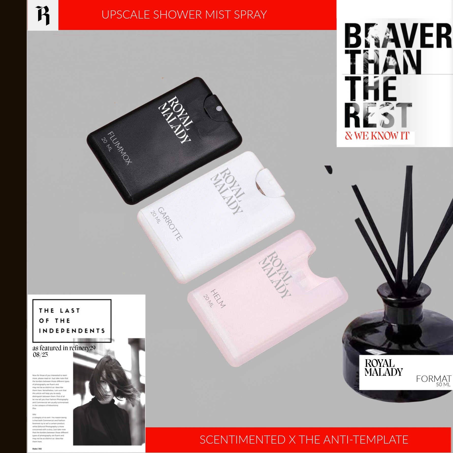 Royal Malady è qualcosa che ho sempre voluto fare in quello spazio innocente chiamato infanzia. La vita reale si è intromessa, così come il mio amore per la gestione della mia agenzia pubblicitaria, e Royal Malady è la mia seconda incursione nel settore della vendita al dettaglio. In Rock Candy Media, realizzo progetti appassionati per dimostrare ai clienti che seguiamo le parole, e queste sono le forme più efficaci di case study. Tuttavia, con Royal Malady, mi è piaciuto così tanto che ho detto pubblicamente al mondo che se mai fosse arrivato il momento di cambiare avrei creato profumi e colonie. Credo negli autodidatti, assumo solo per persone autodidatte e questo si vede nei nostri prodotti. Essendo un'appassionata collezionista di profumi e acqua di colonia, sapevo già cosa avrei voluto migliorare. Ho individuato i punti deboli e quindi avrei potuto fare qualcosa di più intelligente, come i nostri due diversi primer incorporati che altre marche vendono separatamente. Ciascuna delle nostre fragranze è composta da 4-7 strati. Sono perfette da sole, ma il motivo per cui impiegano così tanto tempo a rilasciare un'altra fragranza è che abbiamo dei focus group rigorosi e ognuna delle nostre fragranze è pensata per essere sovrapposta anche a qualsiasi altra fragranza RM, il che non è un'impresa facile.