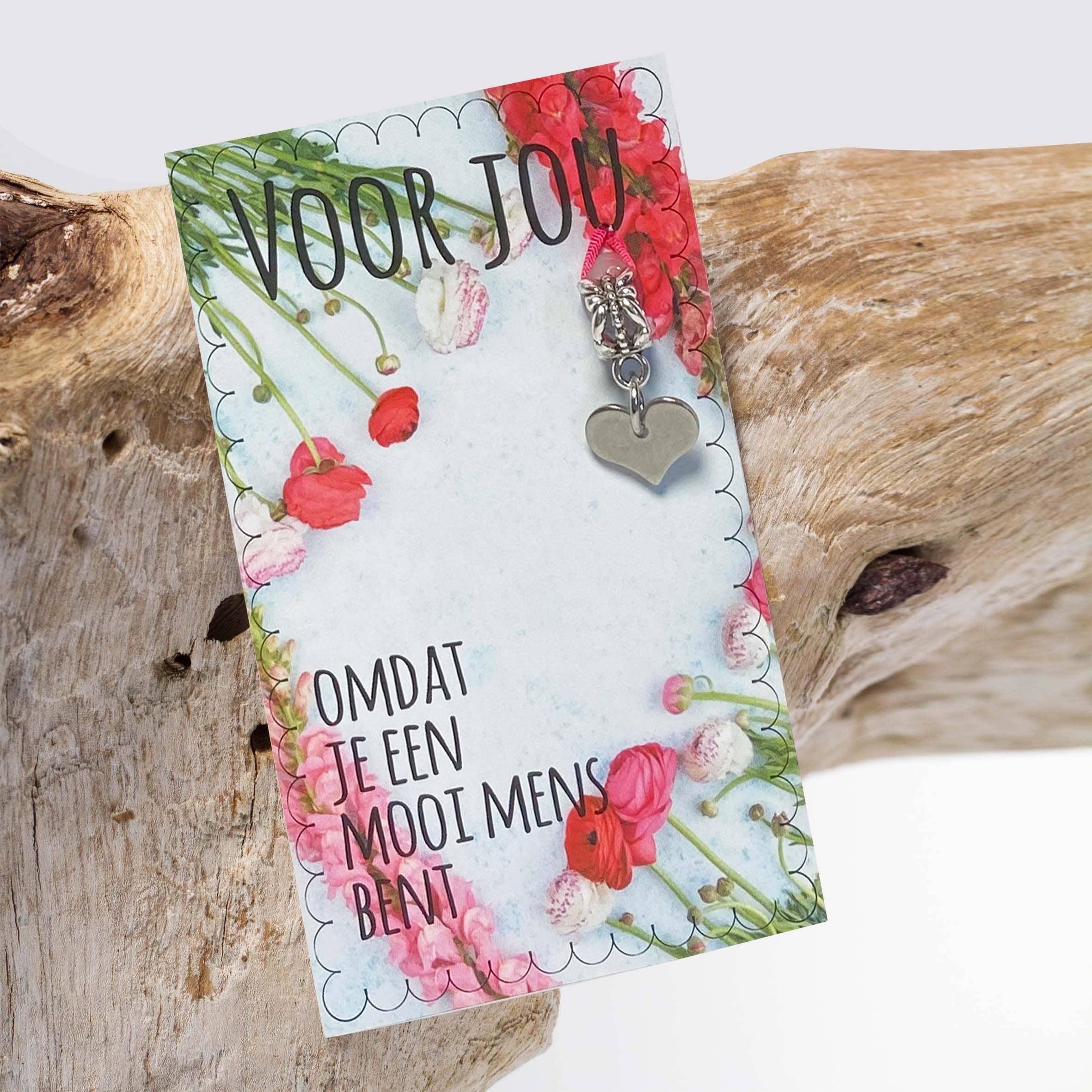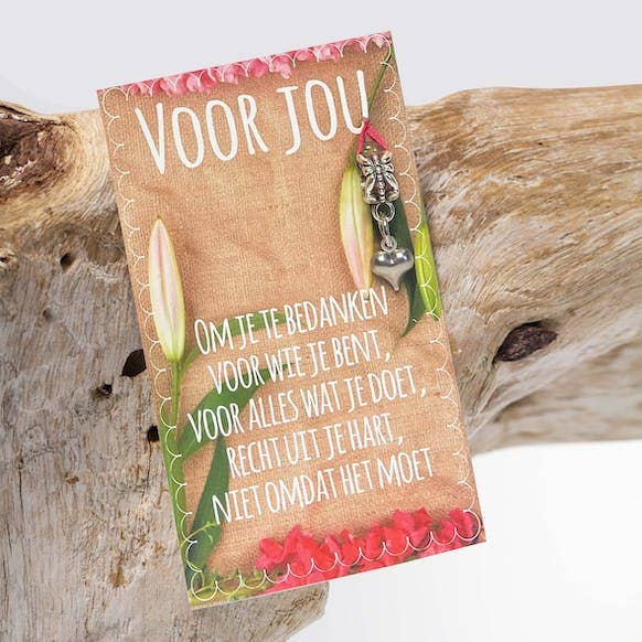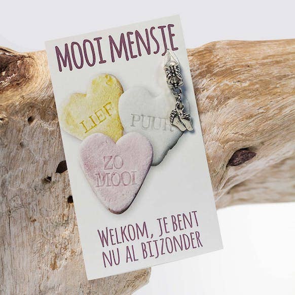 Con la nostra collezione di biglietti di belle persone, vogliamo creare un'idea positiva, continuare a vederci come persone meravigliose! I testi sulle bellissime carte umane sono commoventi complimenti, ringraziamenti e auguri. Ogni bellissimo biglietto umano ha diversi ciondoli attaccati in modo che il destinatario possa portare il tuo caloroso messaggio ovunque si trovi nel mondo. Con un braccialetto, una collana, una borsa, un portafoglio, la tua dolce mente può portarti in giro per il mondo. Bellissime carte umane, un piccolo gesto semplice e di grande effetto. Naturalmente, utilizziamo materiali ecologici e sostenibili per la nostra collezione e lavoriamo in modo equo con un numero di bambini incredibilmente dolci con disabilità intellettiva. Inoltre, doniamo parte di ogni biglietto a un progetto/ente di beneficenza scelto annualmente e nominato dai nostri clienti e fan. La nostra collezione di biglietti di belle persone è composta da vari argomenti tra cui scegliere.
