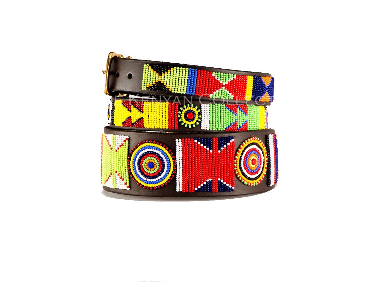 Tutti i prodotti sono fatti a mano dalle mamme della tribù Maasai del Kenya. Attualmente abbiamo 37 mamme che lavorano esclusivamente per TKC. Sono stati scelti a mano per la loro arte, consistenza e qualità . I prodotti includono collari e guinzagli per cani, cinture e cappelli.