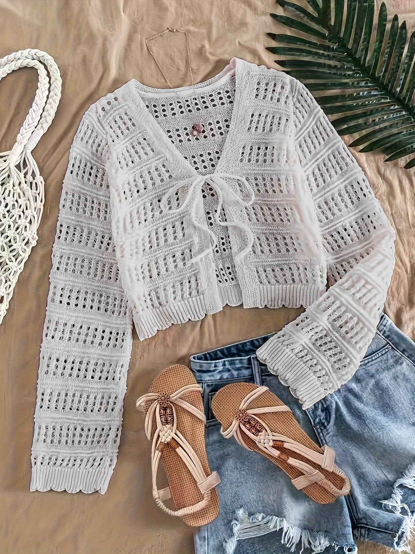 Cardigan in pizzo semitrasparente estivo da donna - Coprispalle all'uncinetto con scollo a V e orlo regolabile, manica lunga, top da vacanza al mare, design aperto e traspirante per uscite casual, copricostume in pizzo da spiaggia, capo da stratificazione estiva, stile a trama all'uncinetto, artigianato di qualità.