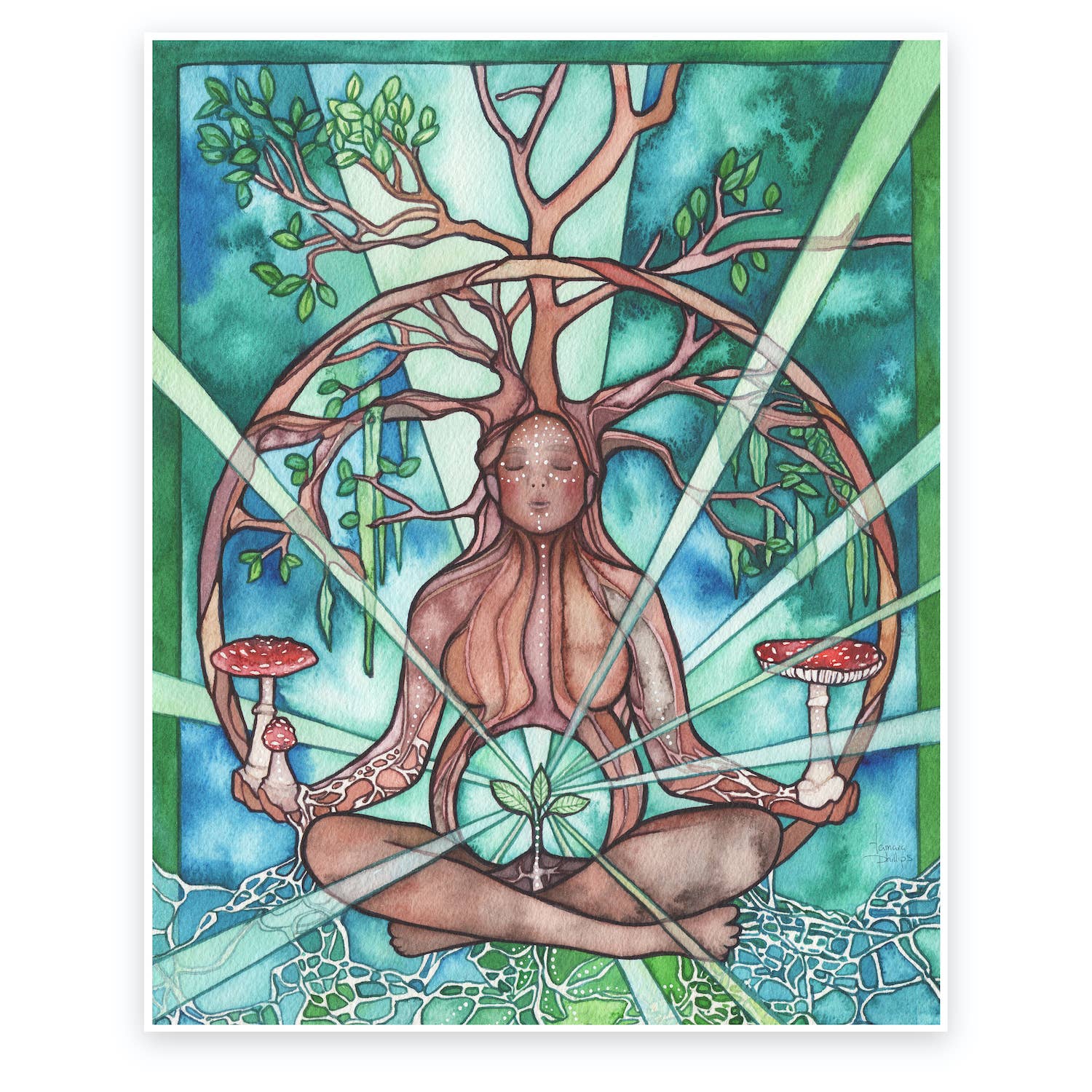 Tamara Phillips è un artista acquerello ispirato alla bellezza cruda del mondo naturale e dalla nostra connessione con esso. Dipinge in vivaci colori della terra con minuscoli pennelli e usa la malleabilità dell'acquerello per esplorare la connessione tra mito, sogno, intuizione e realtà. Tamara trascorre molto tempo a stare nella natura e a sperimentarne la bellezza e il suo valore. Realizza le sue stampe artistiche e si impegna molto per ridurre al minimo la sua impronta sulla Terra. Nata a Vancouver Island, Canada, sede di spettacolari foreste pluviali temperate e di un oceano biologicamente ricco, Tamara ha conseguito il suo BSc in Biologia presso l'Università di Victoria. Viaggiatrice itinerante, ama sia il backcountry che i viaggi mondiali, e ha chiamato città, mare e foresta la sua casa.
