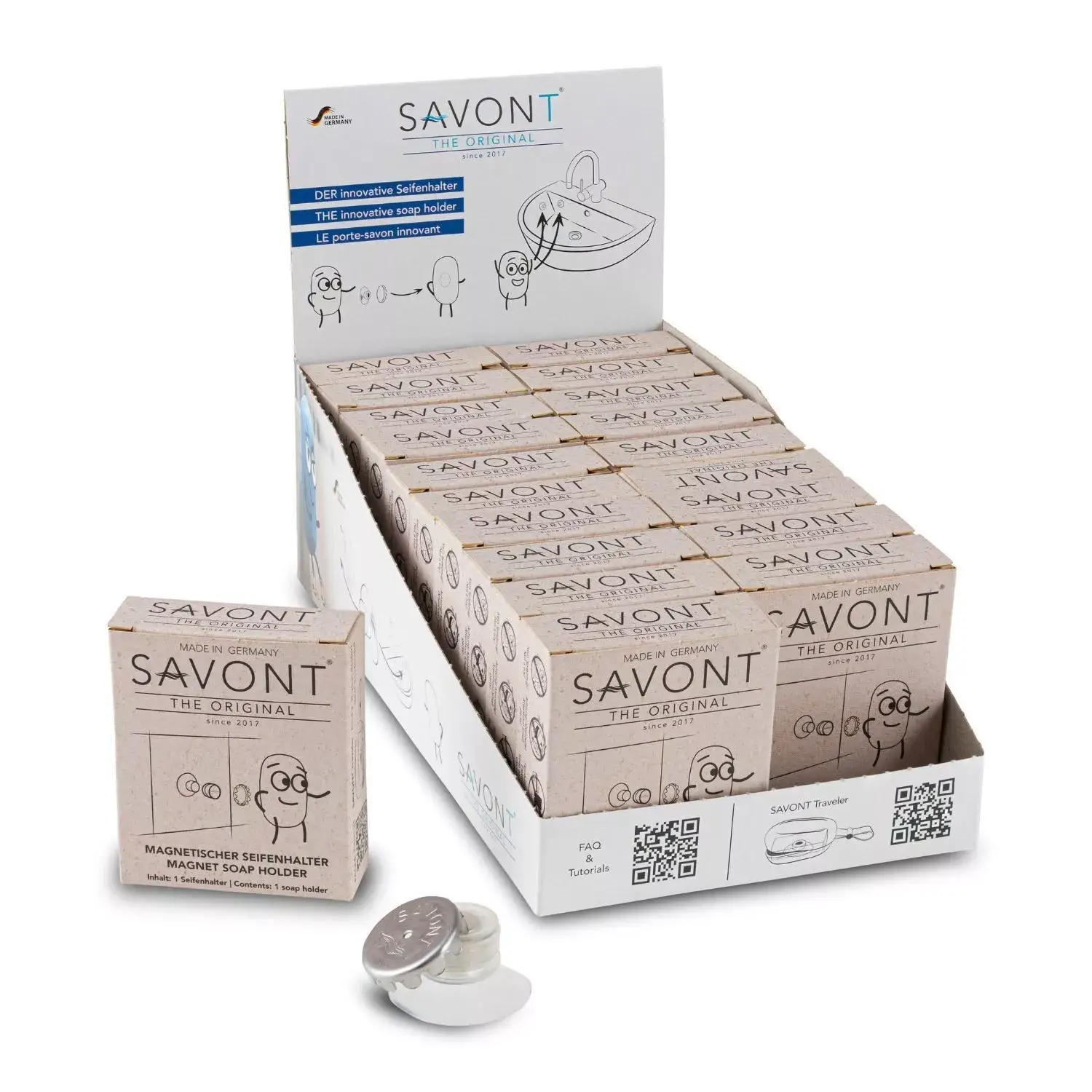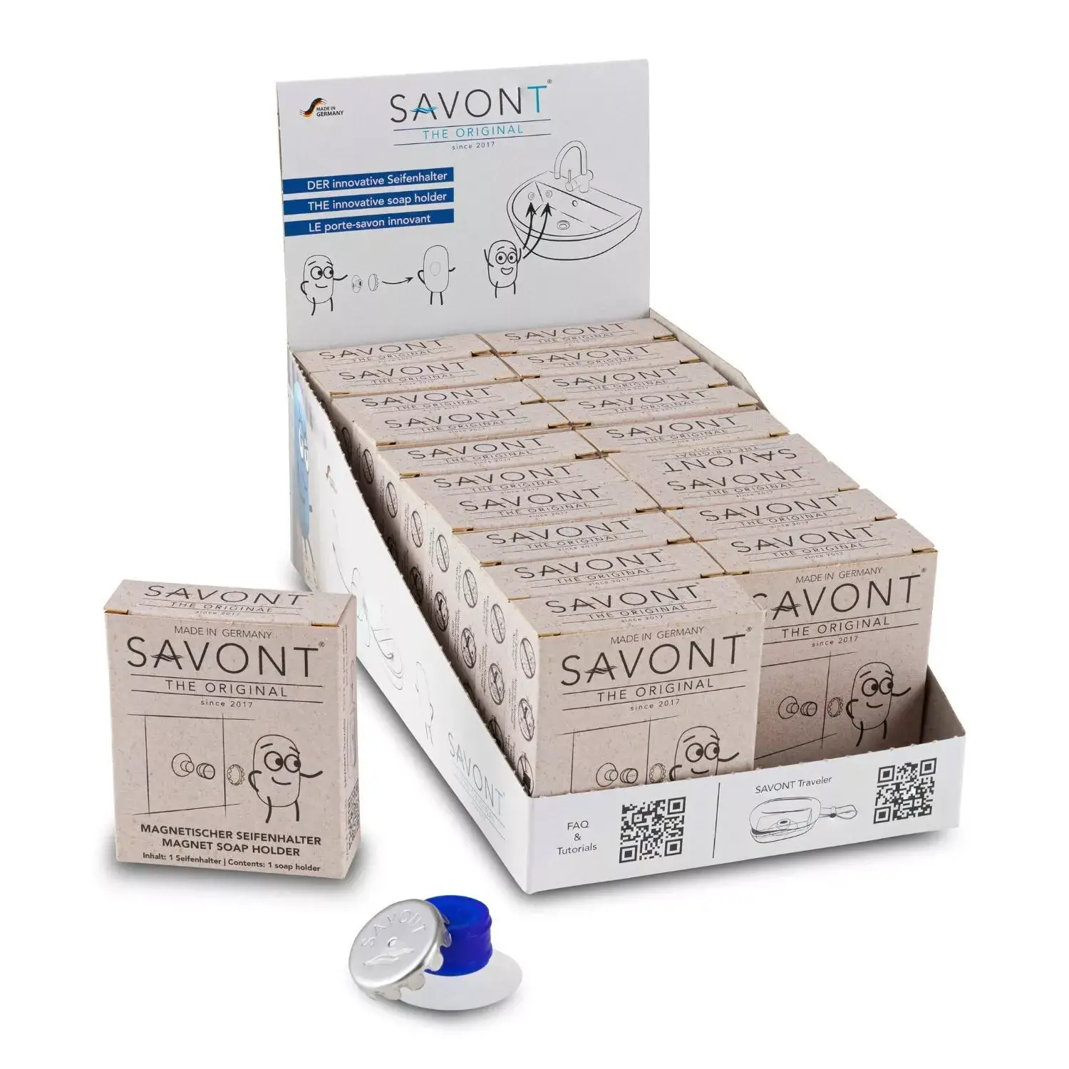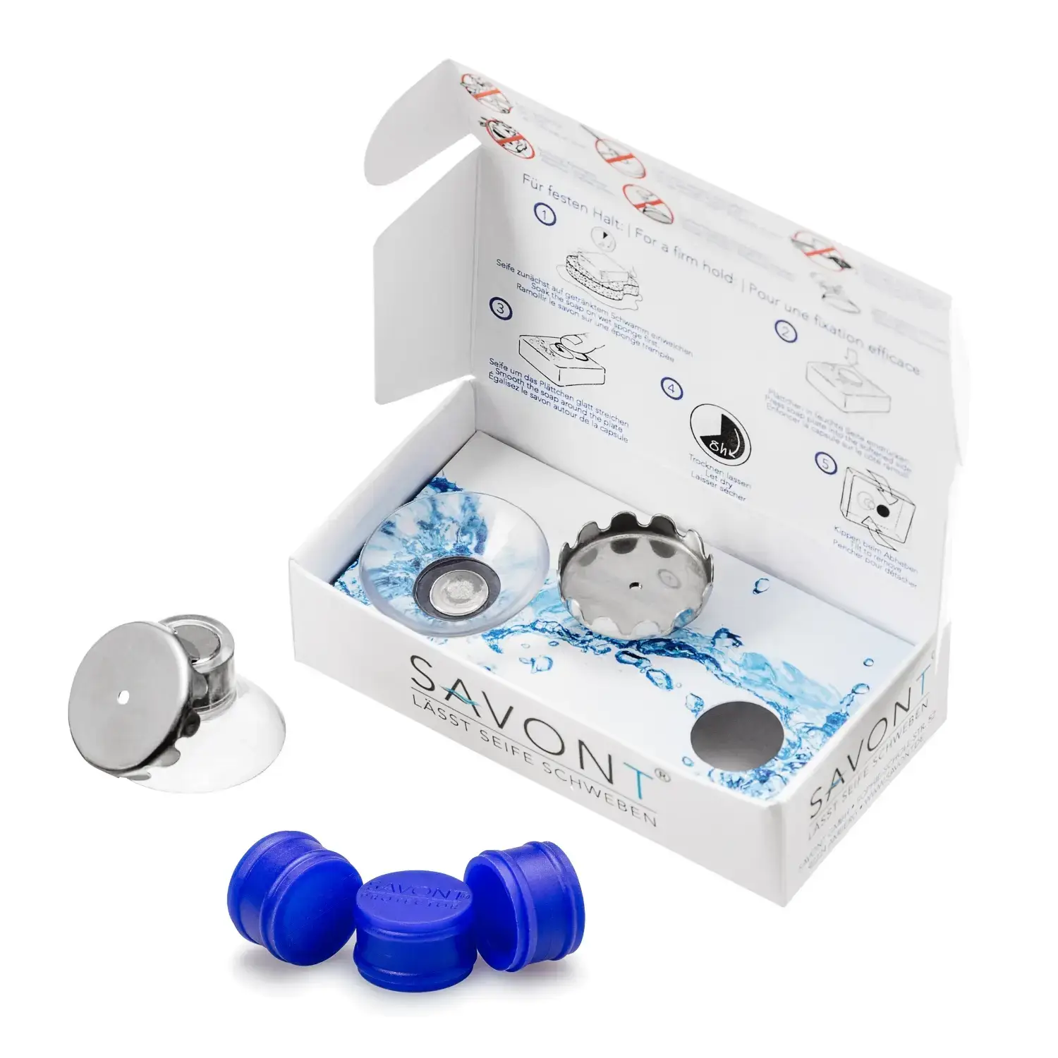 La posizione per il sapone solido. SAVONT è l'inventore del portasapone magnetico – sviluppato nel 2017 dall'esigenza di rendere il sapone solido finalmente pulito e pratico da usare. Con il nostro sistema brevettato – ventosa, magnete, piastrina per sapone – il sapone fluttua asciutto sopra il lavandino o nella doccia. Niente piattini bagnati, niente residui di sapone. Invece: funzionalità chiara, design duraturo, risultato pulito. La nostra missione: rendere il sapone solido di nuovo la scelta migliore in bagno. È efficiente, senza plastica e ha bisogno solo di una cosa – il posto giusto. Ed è proprio qui che interveniamo: SAVONT è la posizione per il sapone solido.