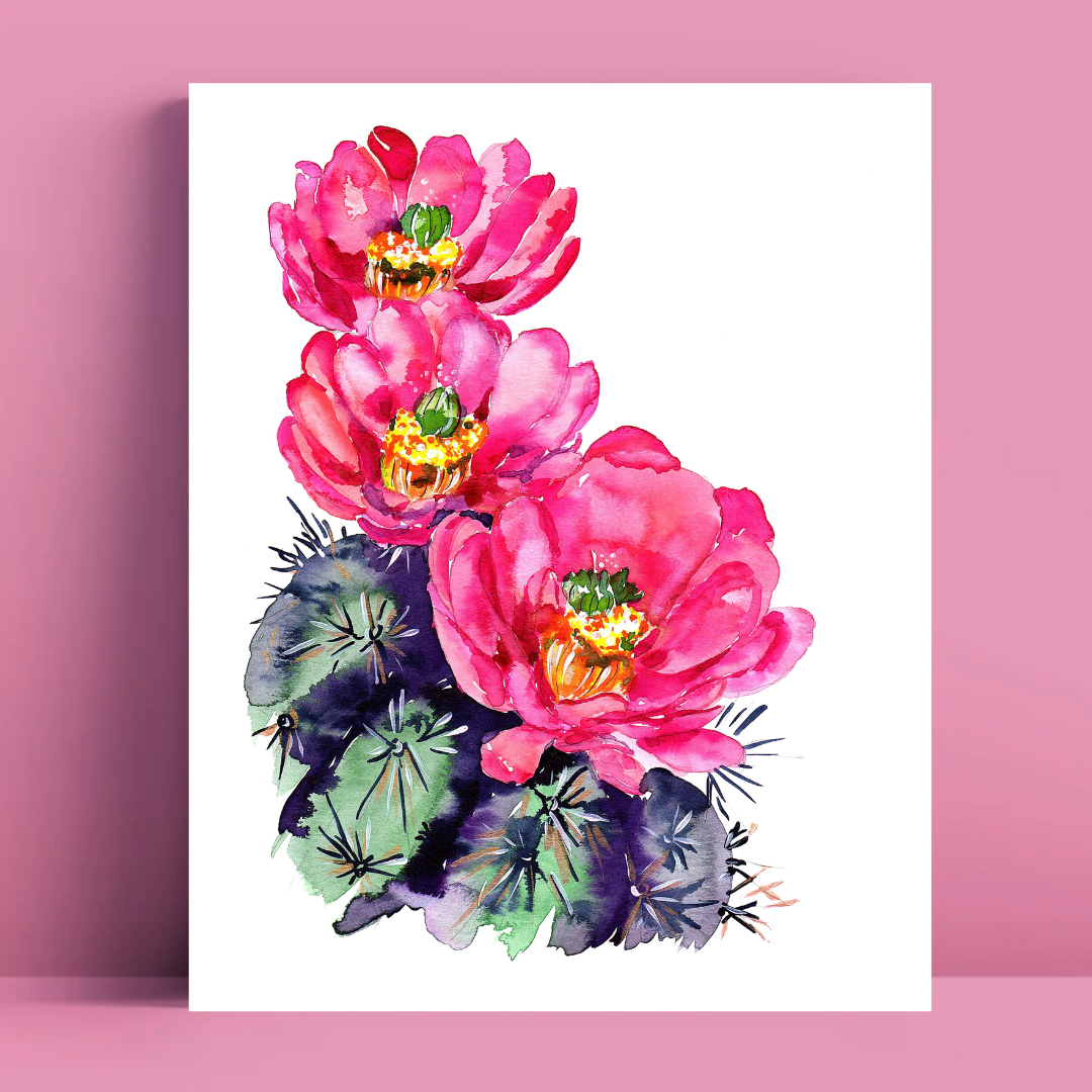 Fiori rosa Fico d'India con stampa acquerello oro