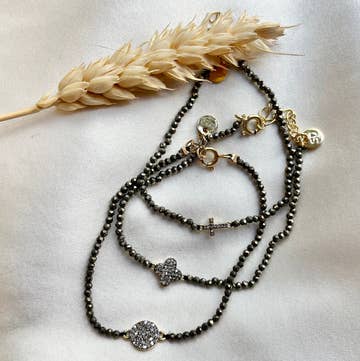 Il ciondolo a forma di malocchio placcato in argento è inserito in oro 14 carati, per rendere questo semplice ed elegante braccialetto malocchio. Le perle di pirite sono avvolte sul filo dell'anello a molla. O Ciondolo placcato in oro malocchio e piccole perline sfaccettate in lapis sono avvolti in filo conduttore in oro 14 carati per rendere questo semplice ed elegante braccialetto malocchio. Le perle di pirite sono avvolte sul filo dell'anello a molla. È 6,5» +1,5 «extender