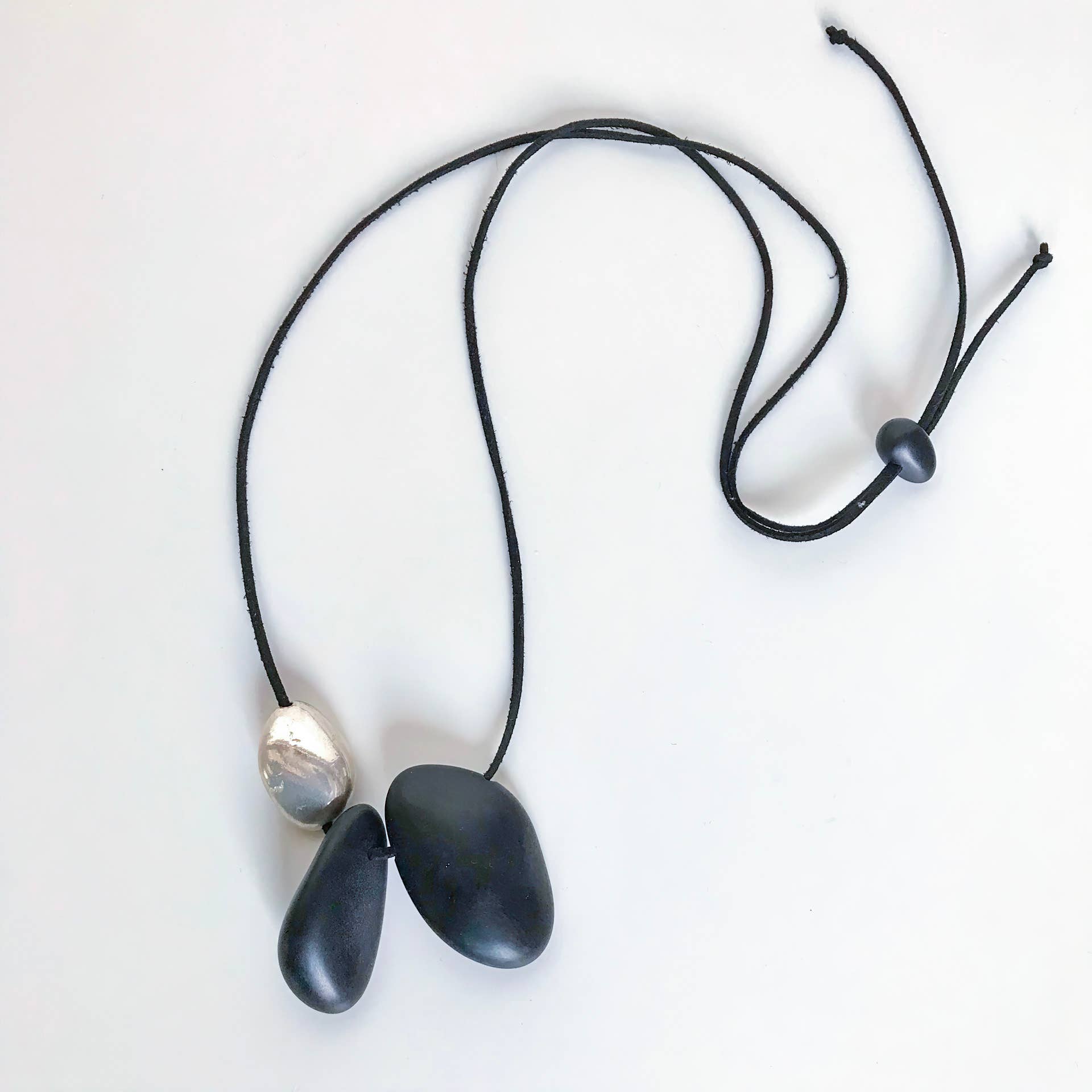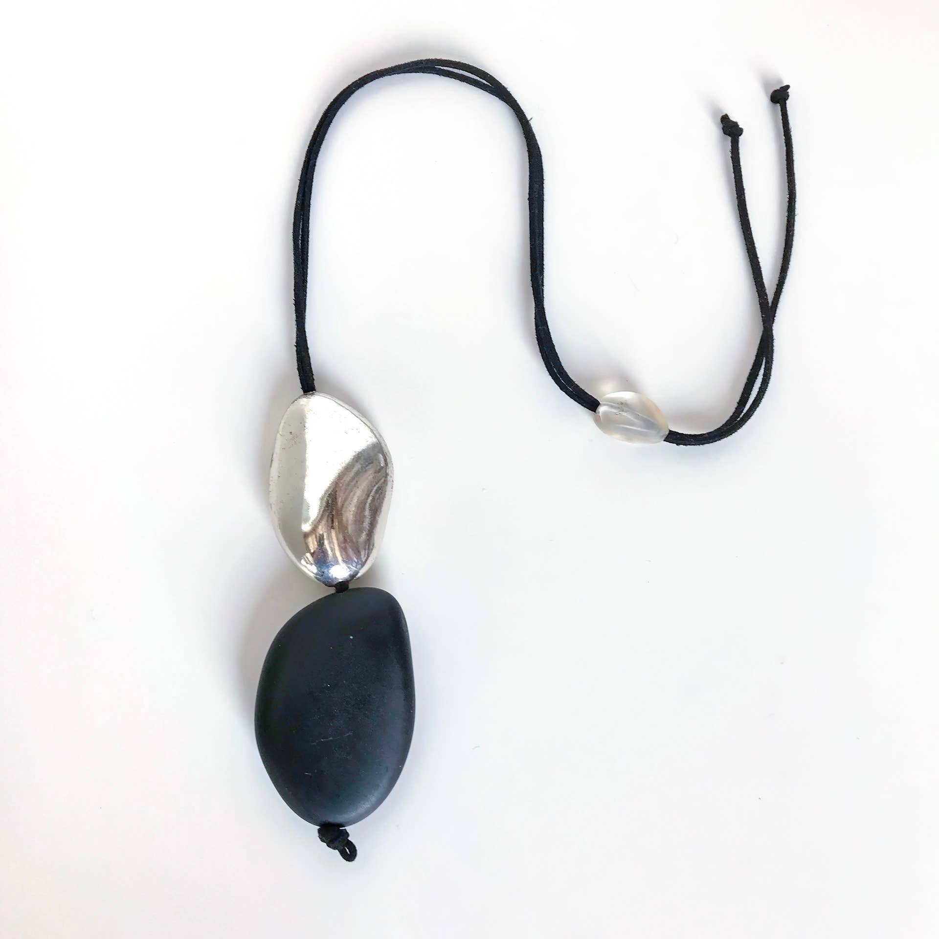 Collana regolabile in bianco e nero con due ciottoli di fiume in resina fusi a mano