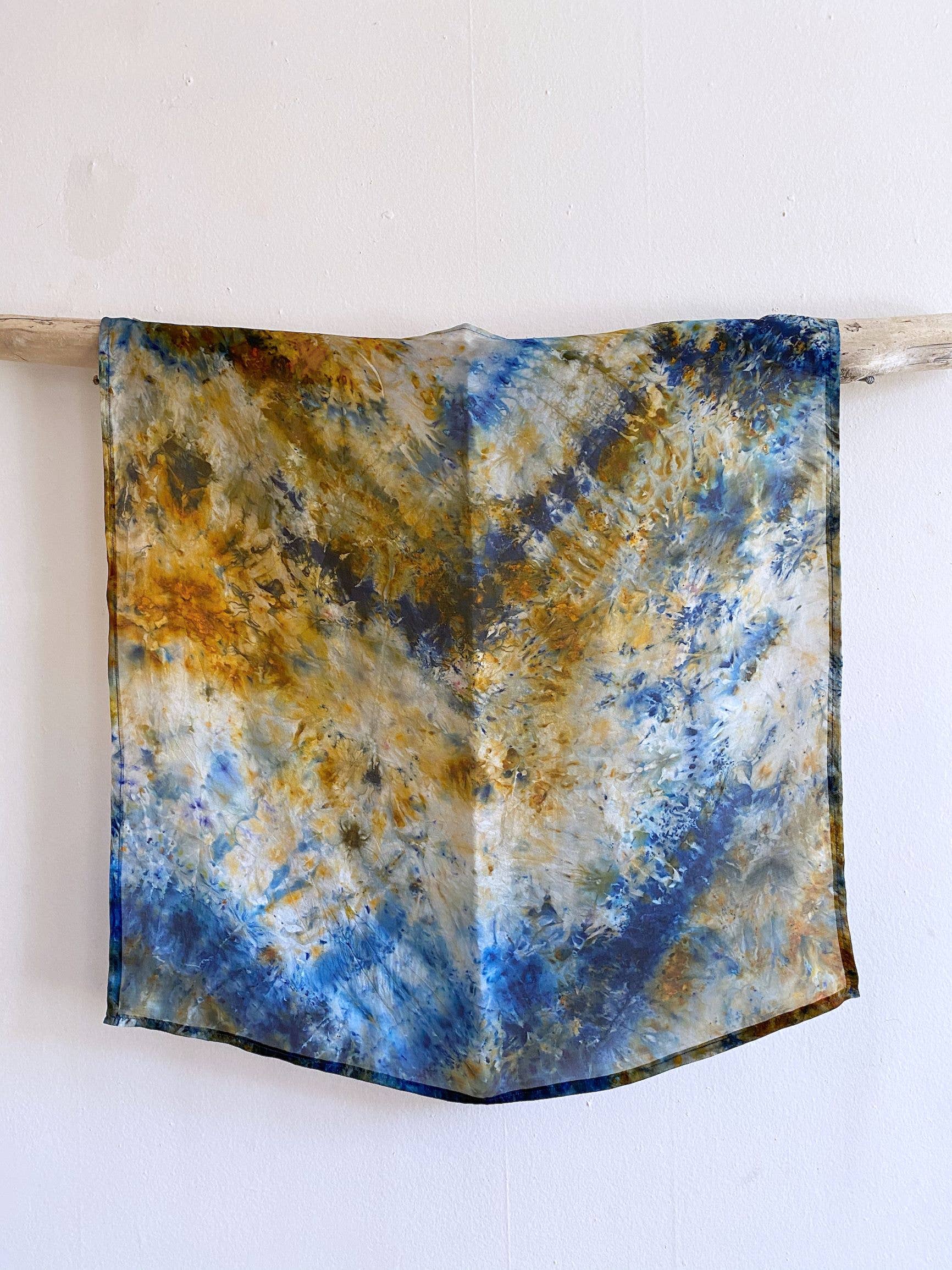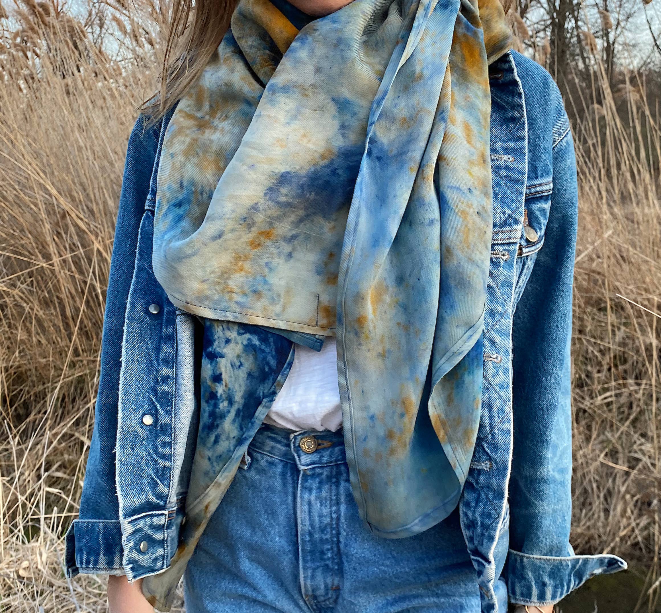 Ampia fascia che può essere indossata come sciarpa o scialle. Perfetto per viaggiare e da usare come coperta leggera. 54 «x 54". 63% seta, 37% lana... Più morbida della lana, più calda della seta. Tinto a mano e prodotto a Burlington, VT A causa della natura del fatto a mano, ogni pezzo avrà delle leggere variazioni. Lavare a mano in acqua fredda con sapone neutro o shampoo
