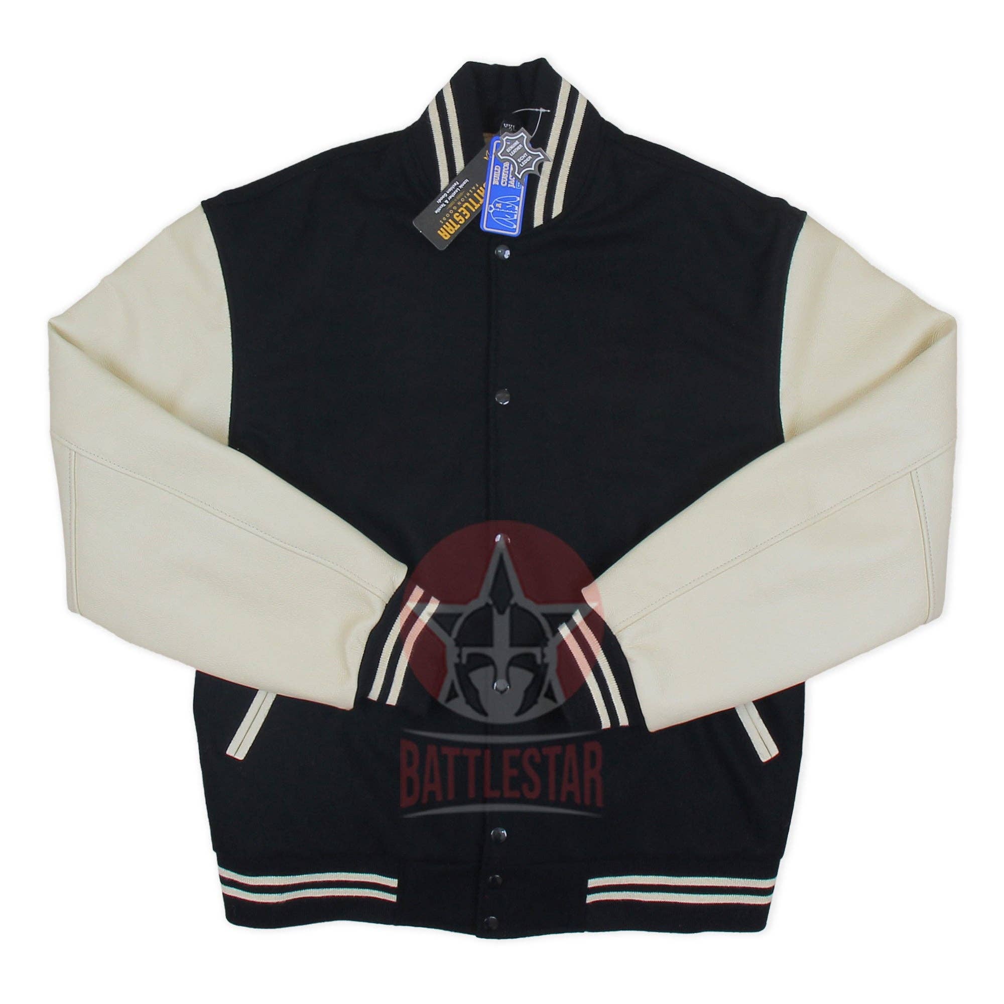 DETTAGLI DELLA GIACCA La classica giacca Varsity * Colore: blu marino/crema * Costina blu marino/crema su collo, polso e parte inferiore/orlo * Due tasche laterali esterne * Manica esterna: pelle bovina * Interno: fodera trapuntata in poliestere e due tasche interne * Stile: Classico Varsity * Cura: LAVARE SOLO A SEC Possiamo aggiungere ricami, stampe o etichette personalizzati su queste giacche secondo la richiesta del cliente. Si applicano costi aggiuntivi.