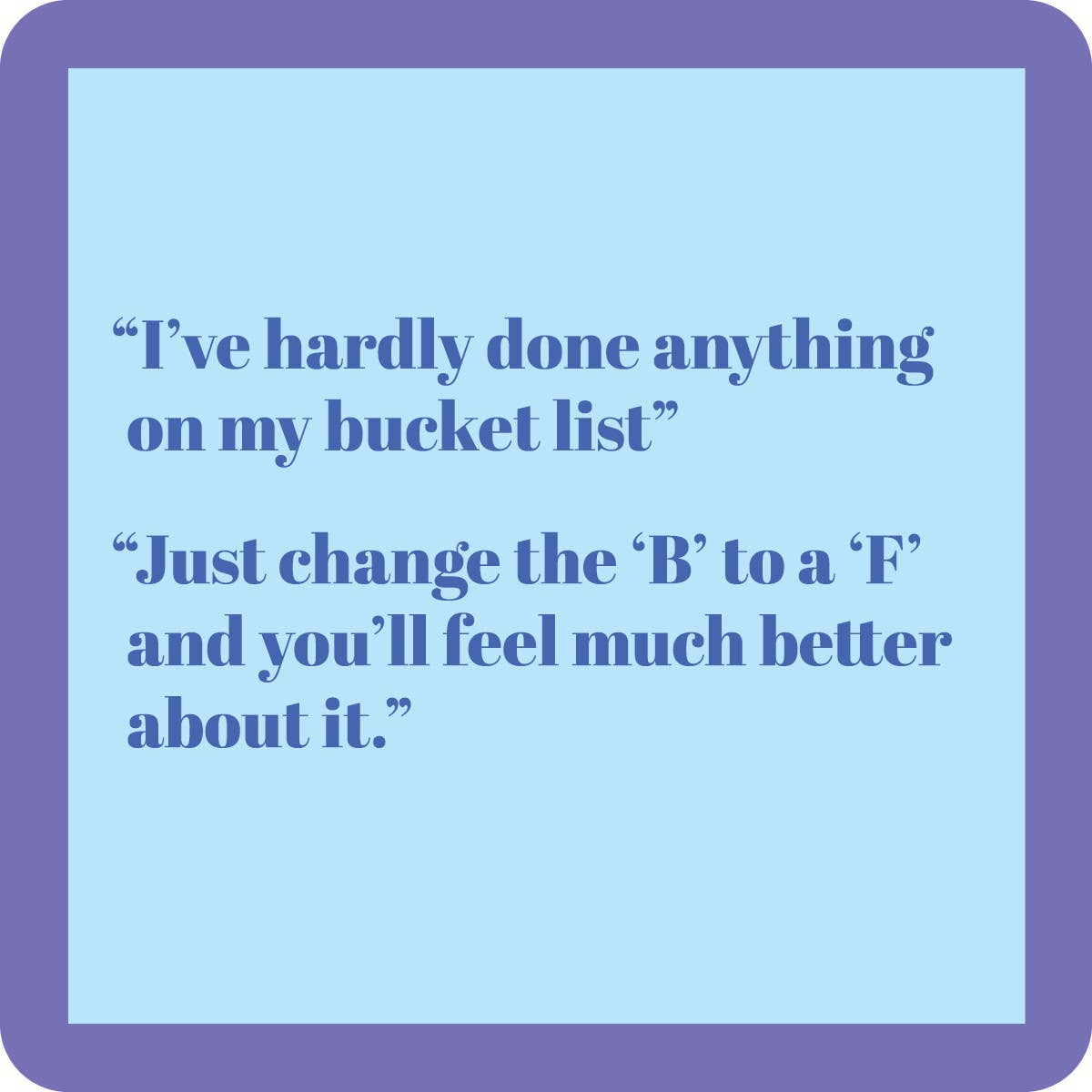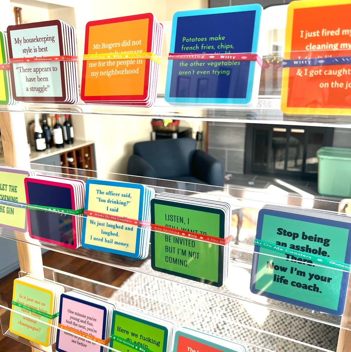 Da Drinks on Me, creiamo momenti esilaranti — perché il tuo drink merita un senso dell'umorismo. Aggiungi un tocco di divertimento ai tavolini da caffè, ai piani cucina e ai carrelli bar dei tuoi clienti con questi sottobicchieri spiritosi. Sono audaci e divertenti! Perfetti per caffè, tè, cocktail, birra, vino o brunch, i nostri sottobicchieri proteggono le superfici aggiungendo un fascino kitsch che i clienti adoreranno. Ideali come regali per la padrona di casa, inaugurazioni, compleanni, festività o come divertenti bomboniere, aggiungono un tocco giocoso e umoristico a qualsiasi casa. Un ottimo articolo da upsell per i clienti in cerca di piccoli accessori per la casa divertenti e da regalare. Offriamo anche fantastici espositori rotanti da pavimento e da banco che occupano solo 1 piede quadrato di spazio e faranno fermare i clienti a ridere e leggerli tutti! Un perfetto complemento nelle sezioni di articoli da bar, regali, feste, decorazioni per la casa, cartoleria, fiori o biglietti d'auguri nel negozio. I sottobicchieri misurano 4"x4" e sono realizzati in resina con un retro in sughero e angoli arrotondati. Made in USA.
