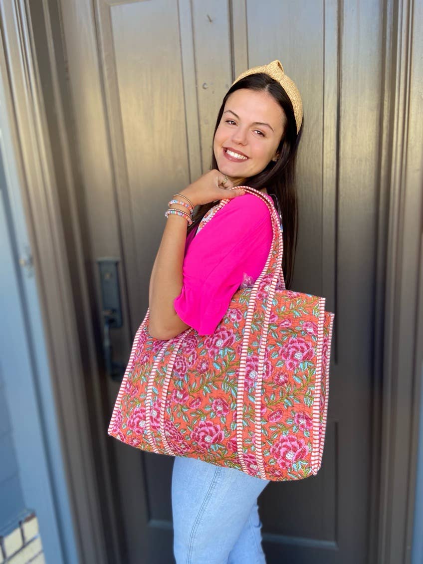 Questa robusta borsa trapuntata presenta un design floreale reversibile e colorato. È elegante e versatile, perfetto per diverse occasioni. Realizzata con materiali resistenti, questa borsa ha le dimensioni giuste per tutte le tue esigenze quotidiane.