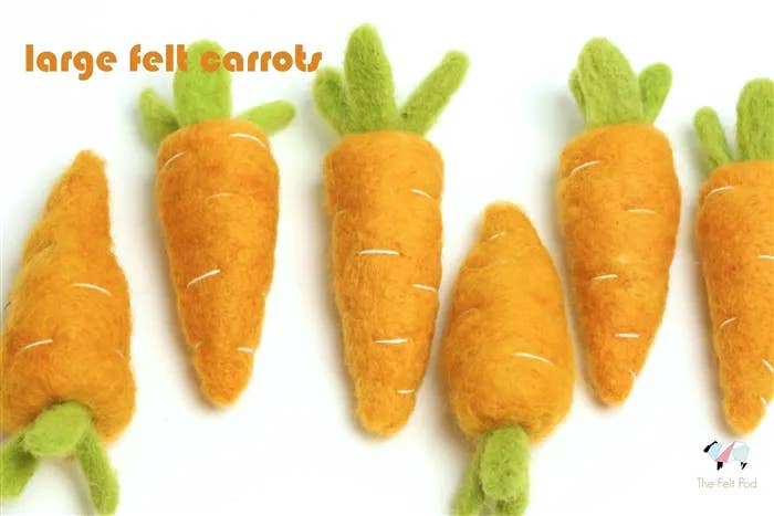 Dimensioni: larghezza 0,5" (nella parte più larga della carota) a 1,5" a 2" altezza (dalla punta della carota alla cima della foglia). La lunghezza della carota presenta alcune variazioni. Salta nella Pasqua con queste adorabili carote in feltro, un'aggiunta perfetta al tuo cestino pasquale o alla decorazione primaverile! Realizzate in morbida lana utilizzando tecniche tradizionali di infeltrimento ad ago, queste forme in feltro portano un tocco caldo e artigianale alle tue celebrazioni pasquali. Usale per creare una festosa ghirlanda pasquale, appendile come ornamenti pasquali sul tuo albero di Pasqua o illumina la tua casa con alcune decorazioni pasquali allegre. Queste carote in feltro fungono anche da cibo in feltro per giochi di fantasia o come giocattolo Waldorf per bambini. Inoltre, sono ottimi giocattoli per gatti. * Contiene piccole parti. L'uso da parte di bambini sotto i 3 anni deve essere sempre supervisionato da un adulto.** feltro, cestino pasquale, riempitivi per ciotole, carote in feltro, cibo in feltro, giocattolo Waldorf, idea di infeltrimento, ghirlanda in feltro, feltro facile, decorazione per la casa, esposizione in negozio, fatto a mano, prodotto in lana, giocattoli per gatti