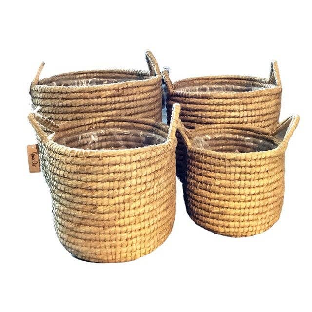 Set di 5 cesti in vimini color naturale, ognuno con fodera in tessuto per una finitura elegante e protettiva.