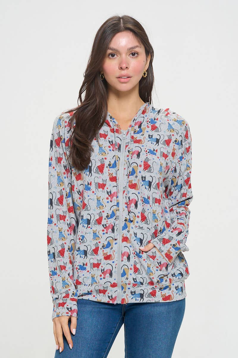 FELPA INVERNALE CON CAPPUCCIO E ZIP A TUNICA CON STAMPA DI GATTI