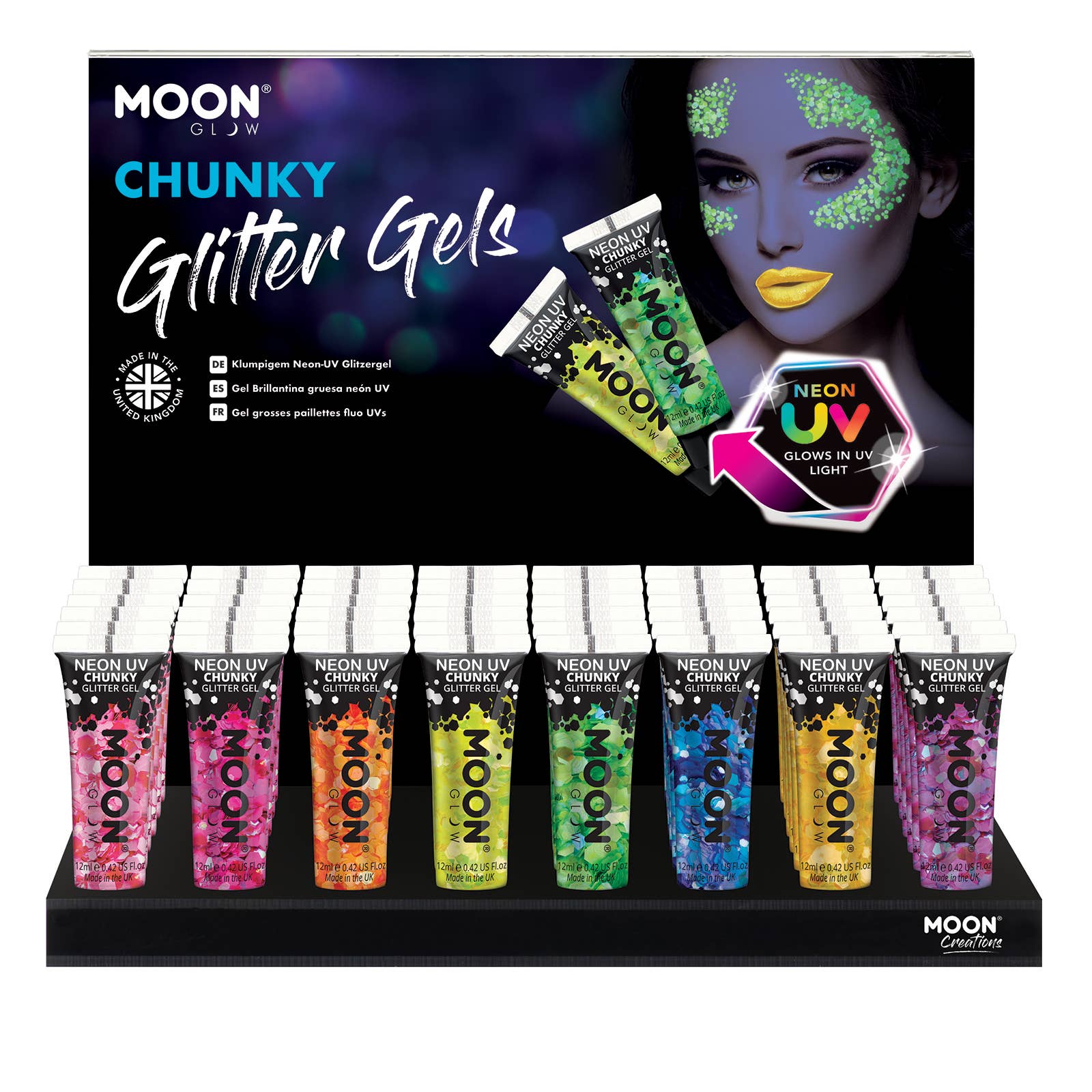 Include 48 pezzi di prodotto e un display acrilico personalizzato. Crea effetti sorprendenti su viso e corpo usando la nostra gamma di 8 colori vivaci di Moon Glow Neon UV Face & Body Paint! Vernici luminose color neon alla luce del giorno che prendono vita sotto l'illuminazione UV/Blacklights, producendo uno spettacolare bagliore UV. Vernici per il viso a base d'acqua pronte all'uso in formato tubetto, la nostra formula senza scaglie e resistente alle sbavature assicura che i tuoi disegni durino tutta la notte. Dopo l'uso, basta rimuovere con acqua e sapone. La collezione Fire Moon Creations è priva di fragranze, parabeni e SLS.