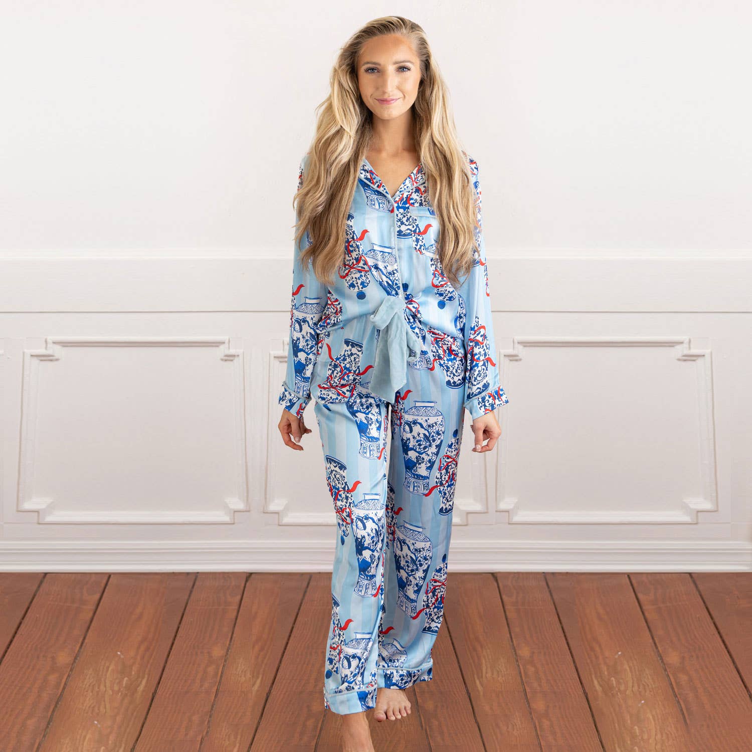 Aggiungi un tocco di eleganza giocosa alle tue serate con questo set di pigiami in raso da donna, dove la texture lussuosa incontra il dettaglio femminile. Il tessuto di raso setoso è morbido e fresco sulla pelle, drappeggiandosi magnificamente per un look che è tanto lusinghiero quanto confortevole. La camicia con bottoni presenta un classico colletto a revers e un delicato piping per una finitura raffinata, mentre graziosi fiocchi di velluto adornano ogni manica, aggiungendo un tocco romantico e inaspettato. Progettato per passare senza sforzo da notti accoglienti a mattine rilassate, è un set che rende ogni giorno di relax un'occasione speciale. I pantaloncini coordinati con volant completano il look con un tocco morbido e civettuolo. Un laccio in velluto in vita non solo assicura la vestibilità perfetta, ma si abbina magnificamente ai dettagli dei fiocchi di velluto per una sensazione coesa e lussuosa. L'orlo delicatamente arricciato aggiunge movimento e fascino, rendendo questi pantaloncini tanto belli quanto comodi. Che siano indossati per te stessa o regalati a qualcuno di speciale, questo set di pigiami in raso unisce stile, comfort e un pizzico di fantasia, creando il perfetto mix di dolcezza e raffinatezza per ogni notte. La stampa blu festiva del set aggiunge un tocco di raffinato fascino natalizio, con intricati vasi di zenzero in stile chinoiserie adornati con fiocchi rossi brillanti. Il motivo bilancia l'eleganza senza tempo con lo spirito giocoso della stagione, rendendolo una scelta eccezionale per le festività e oltre. Il raso lucente e l'opera d'arte dettagliata si uniscono in un design che è in parti uguali classico e celebrativo, un pezzo che rende speciali anche i momenti tranquilli. Il set include - Camicia a maniche lunghe con bottoni e pantaloncini con coulisse in vita Stampato 100% Poliestere Lavare prima di indossare. Girare al rovescio. Lavare in lavatrice a freddo, separatamente. Non candeggiare Asciugare in linea o in asciugatrice a bassa temperatura. Non stirare. Non lavare a secco. Progettato negli USA; Importato XS/S = Taglia donna 0-4 MD = Taglia donna 6-8 L/XL = Taglia donna 10-14