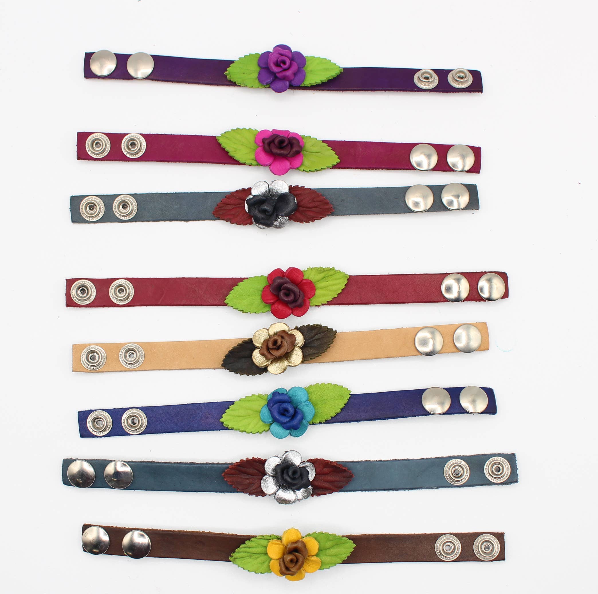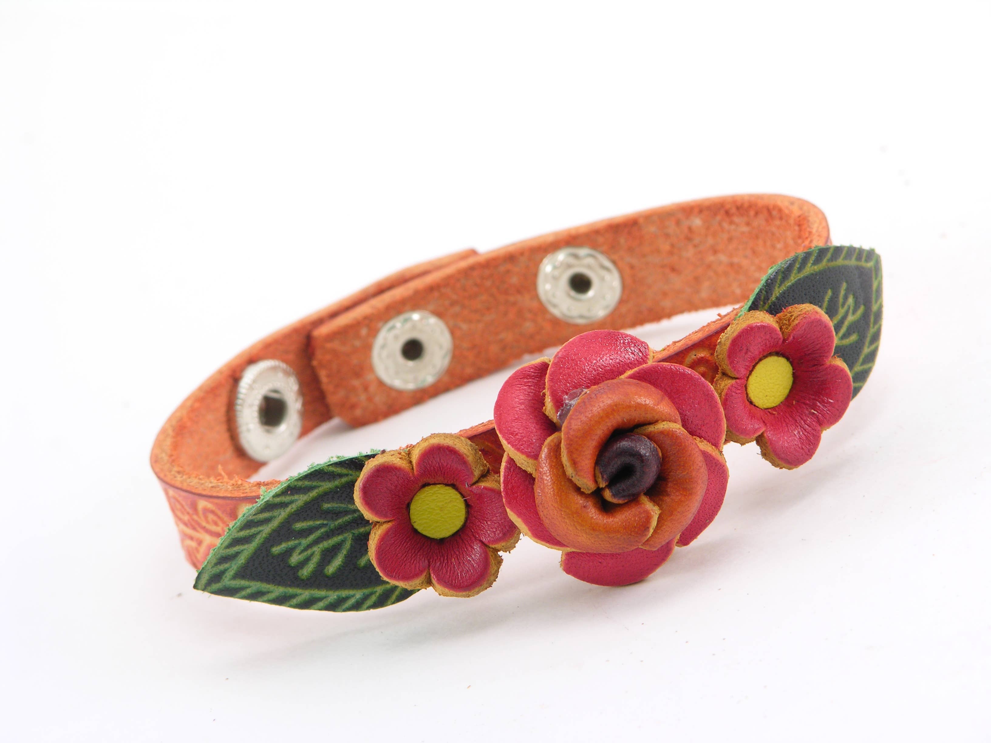 144 braccialetti in pelle con fiore. I nostri braccialetti con piccoli fiori in vera pelle di alta qualità sono tra i nostri articoli più popolari. Sono disponibili in un'ampia varietà di fiori 3D e colori e sono regolabili con due set di bottoni a pressione in metallo. Adatti alla maggior parte delle dimensioni del polso. Lunghezza approssimativa da 7 a 8 pollici. Larghezza è 1/2. Questi braccialetti sono adatti a tutte le età, bambini, ragazze e mamme, anche le nonne li indossano. Espositore incluso (valore: 45/ciascuno per l'espositore). Si prega di notare che tutti i prodotti sono fatti a mano e possono variare leggermente da caso a caso.