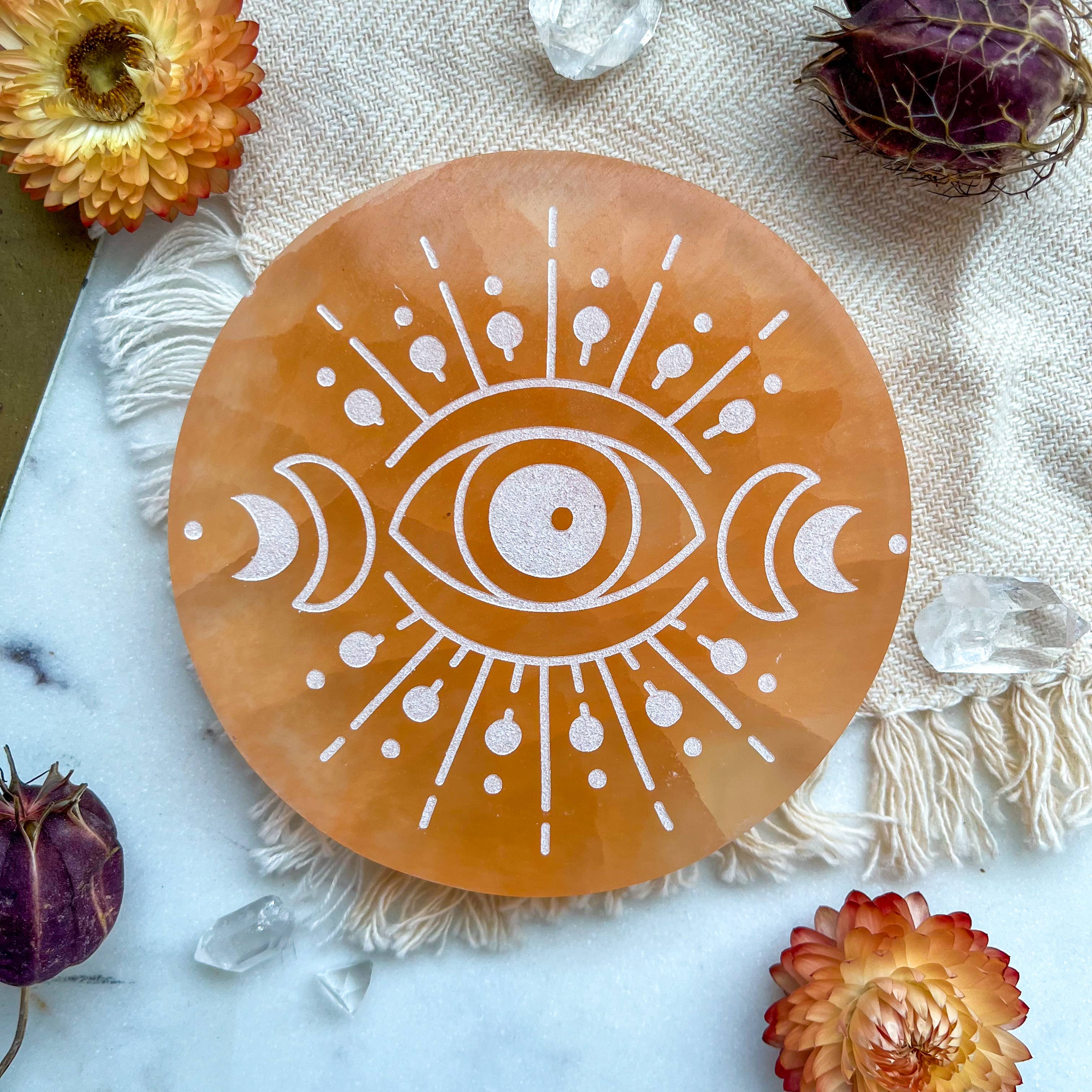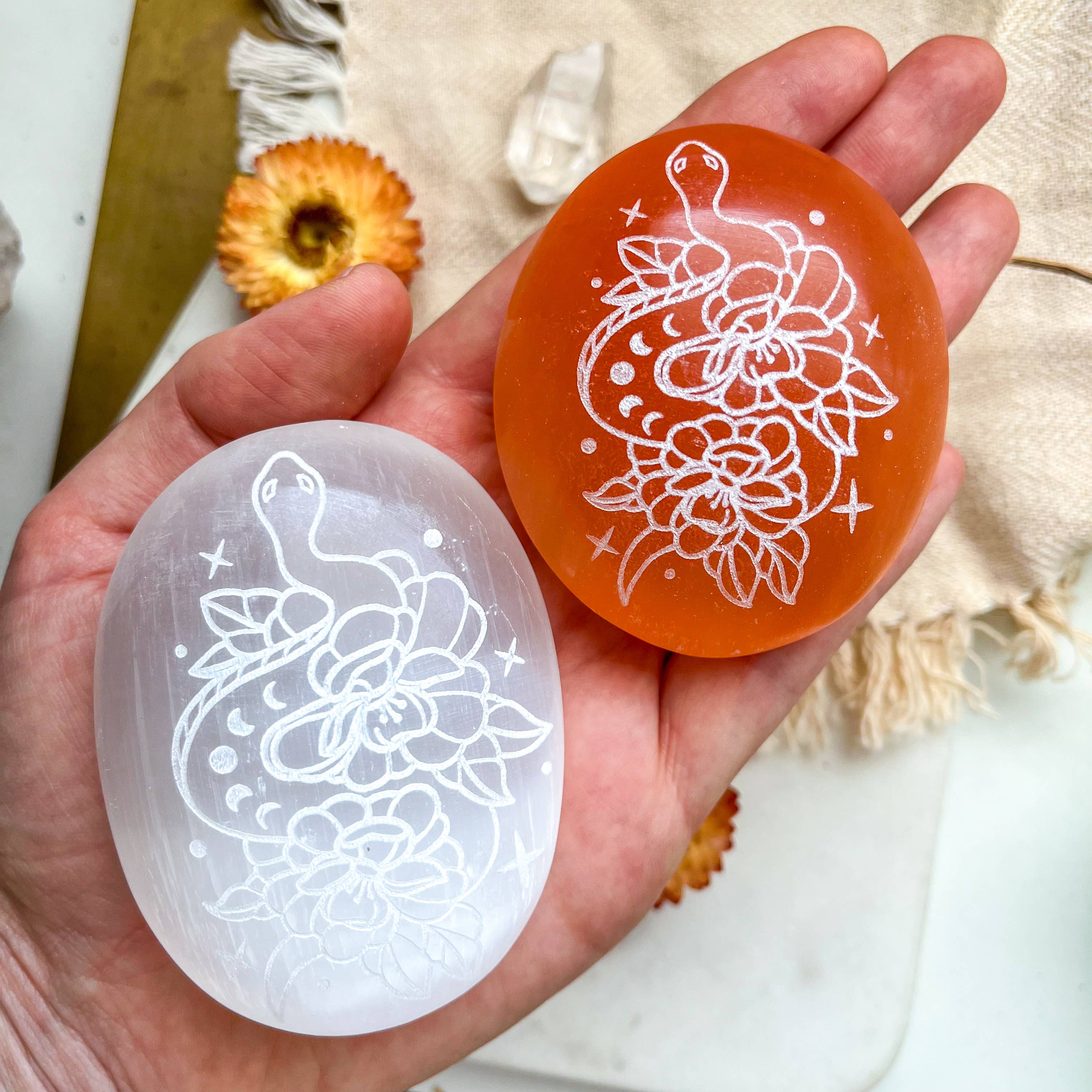 Ti presentiamo la nostra nuova piastra di ricarica e pulizia in cristallo di selenite Celestial Snake. Realizzata con bellezza naturale, la nostra piastra di ricarica in cristallo di selenite è realizzata in pietra di selenite bianca pura o pesca di alta qualità. Come griglia o lastra di cristallo, irradia energia positiva e crea un'atmosfera rilassante. È un regalo perfetto per chi ama le pietre naturali, le griglie di cristallo. La piastra di ricarica in cristallo di selenite non è solo un elemento decorativo; è anche un potente strumento che può aiutare a caricare e pulire altri cristalli. Le sue proprietà uniche amplificano e purificano l'energia di qualsiasi altro cristallo che viene posto su di esso. Il design è splendidamente inciso sulla piastra di ricarica in cristallo di selenite, rendendola un'aggiunta accattivante ed elegante al tuo arredamento di Halloween, Autunno o Spooky Season.