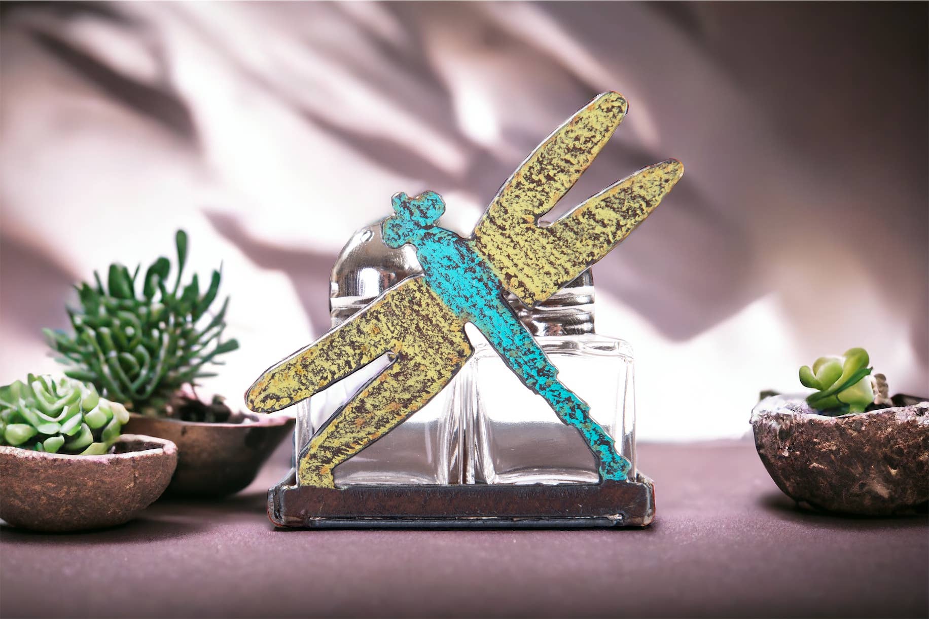 Contenitore per sale e pepe in metallo verniciato a colori con colori assortiti. Viene fornito con i due shaker in vetro. Fascino rustico e design funzionale. Questo piccolo design unico è perfetto per tenere sale e pepe a portata di mano. Ideale anche per vivere in camper. Che si tratti di grandi riunioni o di piccole cene intime, è un'aggiunta ideale agli elementi essenziali della tua cucina. Realizzato con acciaio americano riciclato resistente alle intemperie dal sole e costruito negli Stati Uniti da un piccolo produttore di lotti. Lo studio Whimsies è in Texas.