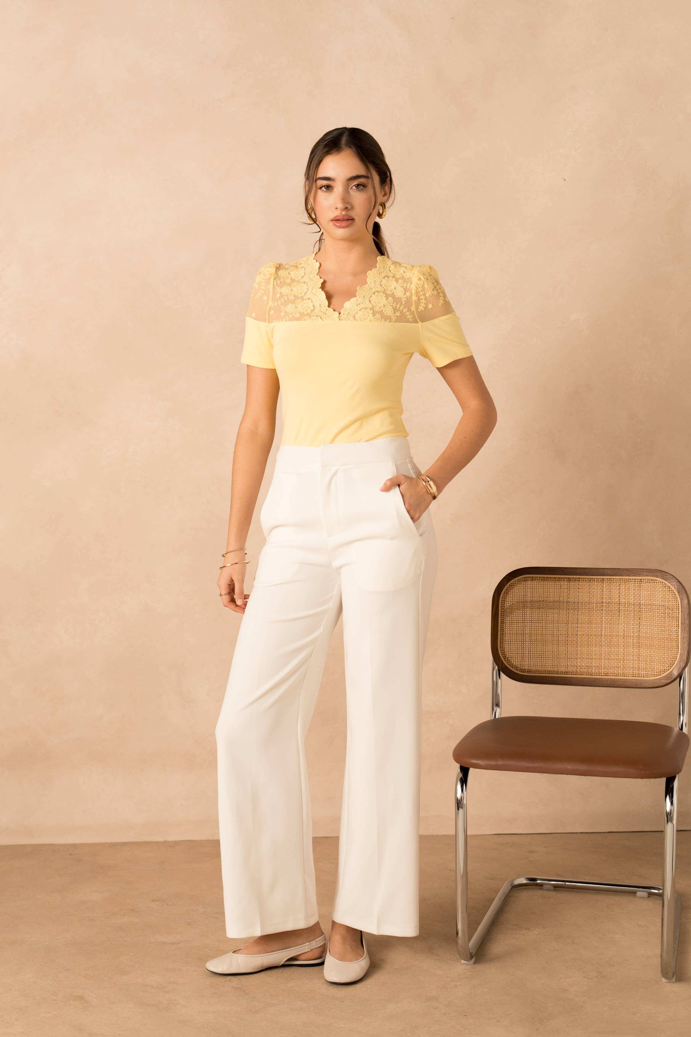 Camicia in pizzo con motivi traforati. Pizzo presente sul davanti e sotto le ascelle. Si può abbinare alla giacca V340 e ai pantaloni P985. Confezione composta da 6 pezzi: 2 taglie S / 2 taglie M / 2 taglie L. Il modello è alto 1,74 m e indossa una taglia S.