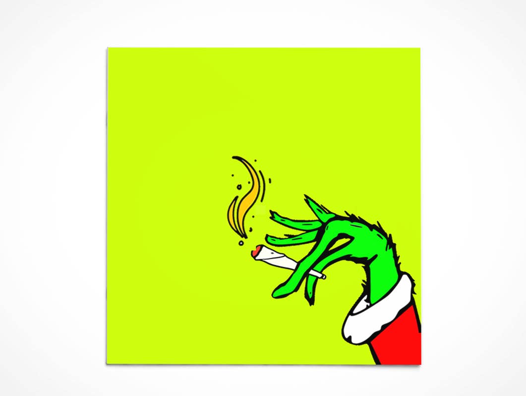 Biglietto di auguri ispirato ai meme 5 «x 5" con busta bianca e sigillo protettivo in plastica. Carta bianca da 114 libbre, a colori, finitura opaca, con logo del negozio e sito web sul retro. Interno: Happy Holidays