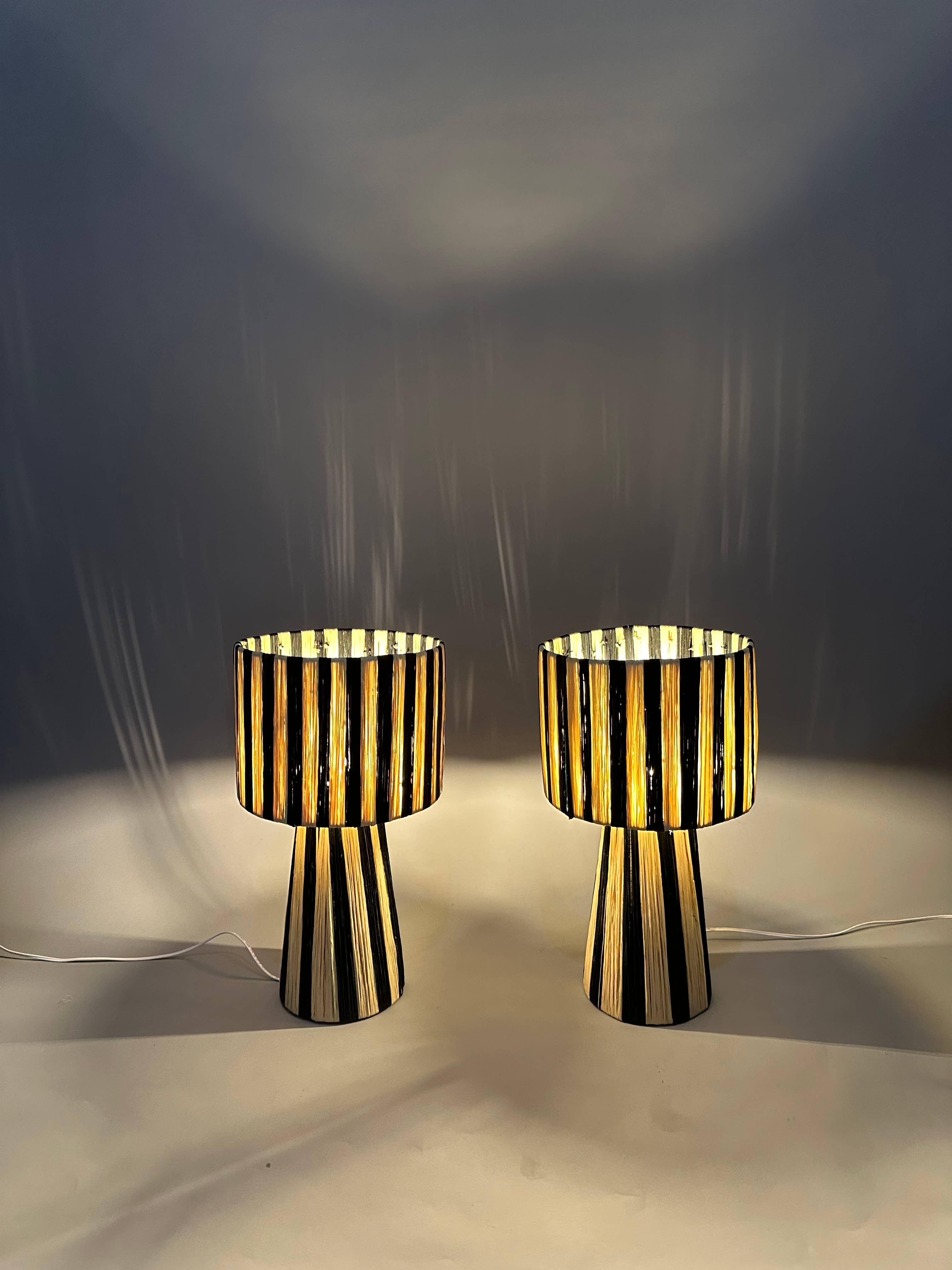 Lampada da tavolo in rafia naturale con sottili righe all'ingrosso