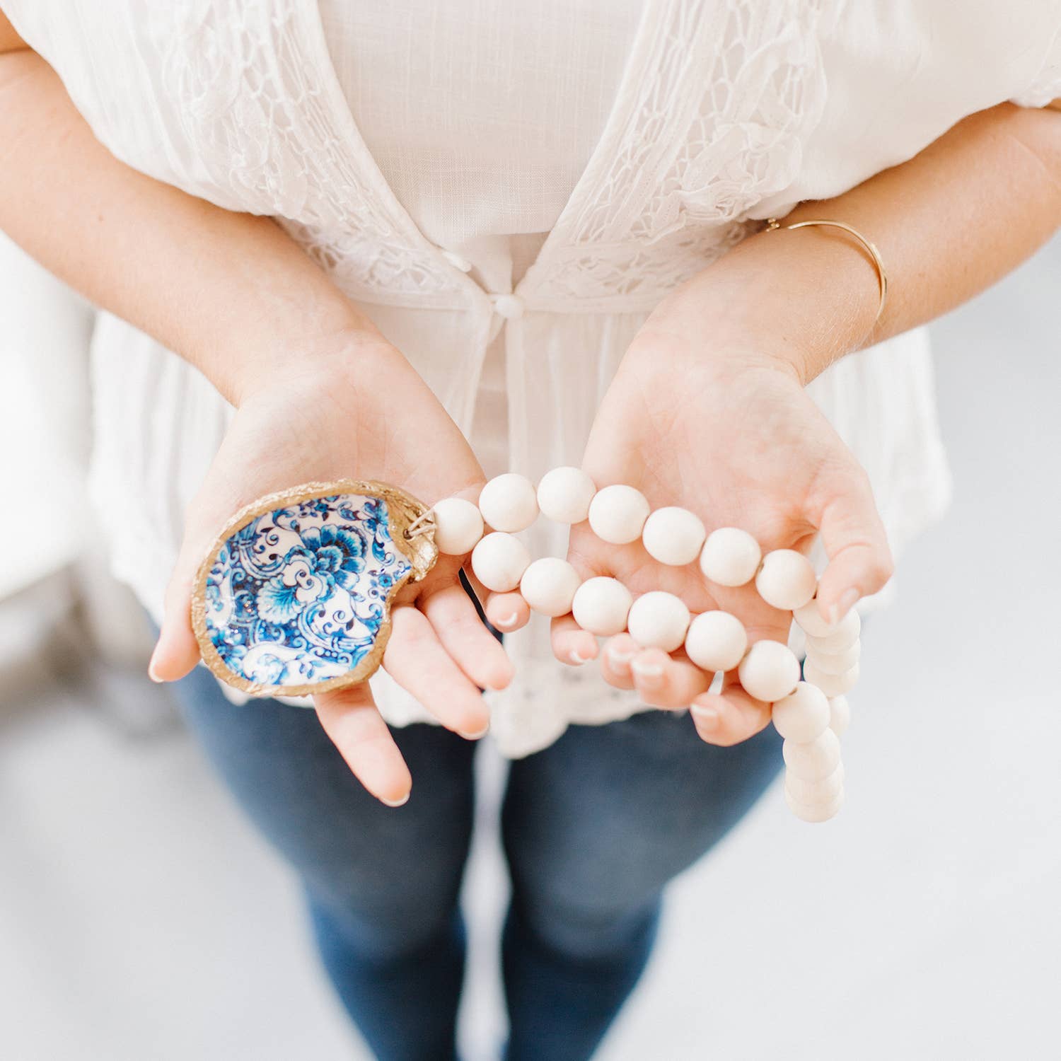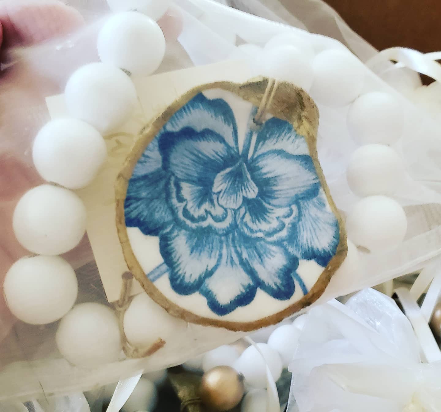 Esprimi la gratitudine con l'ultima aggiunta alla nostra linea di perline riciclate che benedice i gusci di ostrica, con i nostri gusci di ostrica decoupage indigo. La loro estetica elegante e senza tempo trae ispirazione dalla bellezza classica di Delft e dalla delicata porcellana fine. Queste conchiglie realizzate a mano presentano disegni delicati in ricche tonalità di cobalto, indaco e avorio compensati dal nostro caratteristico bordo dorato. Ogni ciondolo è incorniciato da intramontabili perle di legno bianche per ricordarti tutte le perle della tua vita. Mettili in un cestino di erba dolce, drappeggiali sul mantello o regalane un filo come perline di benvenuto per i nuovi proprietari di casa o come regalo per gli sposi. Le nostre perline Indigo Oyster Shell Blessing sono lunghe circa 11 pollici con un ciondolo a conchiglia che misura circa 5,1 x 8,9 cm. Abbiamo incorniciato il ciondolo decoupage a forma di conchiglia di ostrica con classiche perline di legno come dolce ricordo dei doni della natura e della bellezza della semplicità.