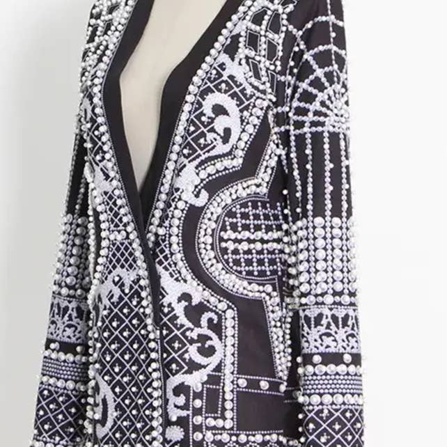 Scopri un tocco di eleganza con il nostro completo chic composto da giacca con paillettes e perline e gonna a coda di pesce. Questo splendido completo in due pezzi presenta una giacca colorblock arricchita da una brillante sequenza di paillettes e perline, abbinata a una graziosa gonna a coda di pesce che scende fino al pavimento. I dettagli intricati delle perline e delle paillettes riflettono la luce magnificamente, rendendo questo capo perfetto per eventi formali o occasioni di lavoro.