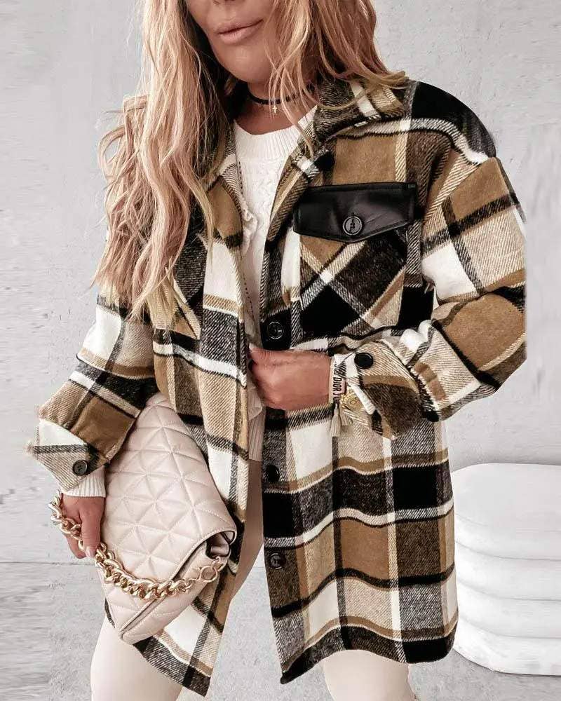 nuova giacca abbottonata a spalla scesa con dettagli scozzesi stile: casual tipo: shacket materiale: poliestere scollo: colletto rovesciato stile manica: manica lunga lunghezza: al ginocchio tipo di motivo: plaid decorazione: bottone tipo di vestibilità: oversize occasione: tutti i giorni