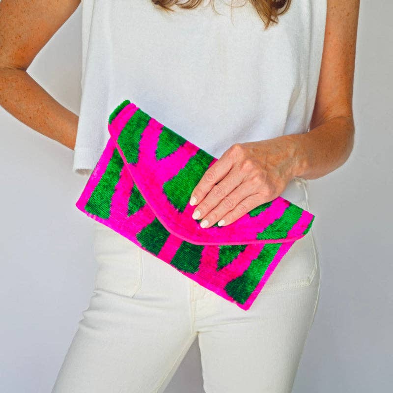 Dalle uscite diurne agli appuntamenti serali, la nostra pochette giocosa è il tuo nuovo accessorio di riferimento. Progettata con spazio sufficiente per il tuo rossetto, telefono e chiavi, è il perfetto connubio di moda e funzionalità. Esplora le nostre opzioni personalizzabili per creare una pochette che completi il tuo stile distintivo e si abbini magnificamente alle tue scarpe preferite. 16,5 cm H x 6,5 cm D x 26,5 cm L VELLUTO * Materiale esterno: Velluto Ikat * Fodera: Completamente imbottita e foderata * Tipo di chiusura: Magnetica * Tessuto proveniente da: Uzbekistan / Fatto a mano in Turchia * Consiglio di protezione: Consigliamo di utilizzare Scotch Guard per una maggiore durata.