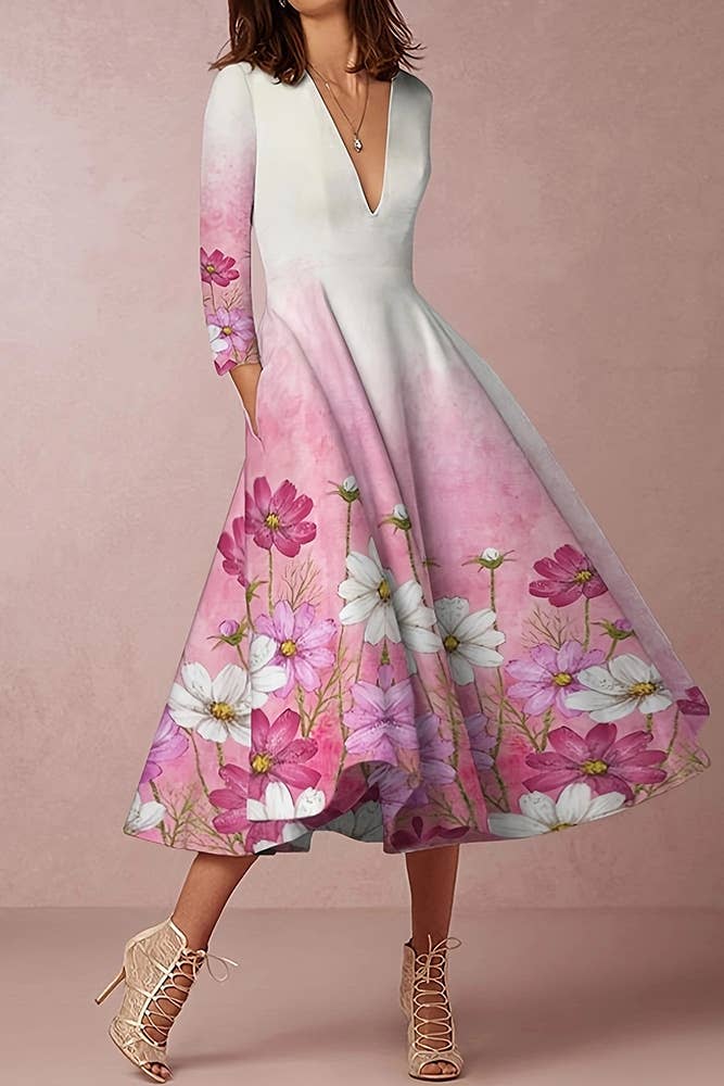 Maxi abito con bordo in pizzo con scollo a V con stampa floreale bianca ZK820 all'ingrosso
