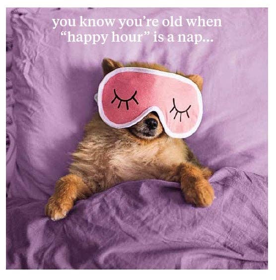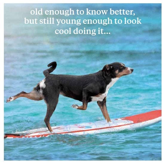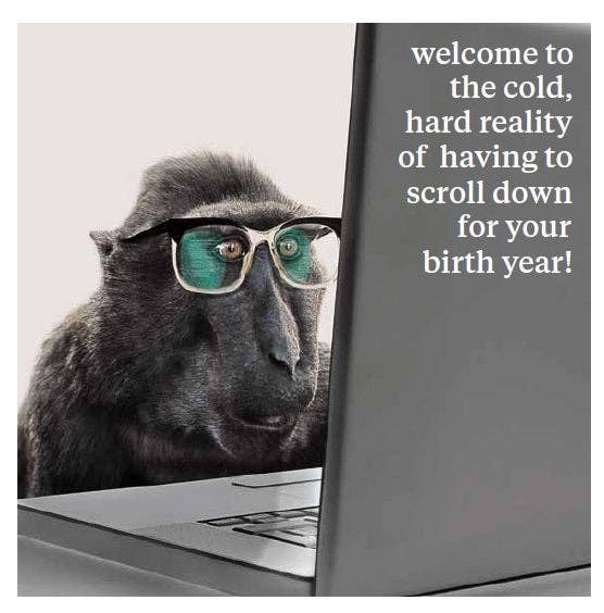 Il biglietto Remind Me How Old misura 16 cm x 16 cm e viene fornito avvolto in cellophane con una busta. Il suo design include un'immagine di animali e un testo comico. Interno vuoto.