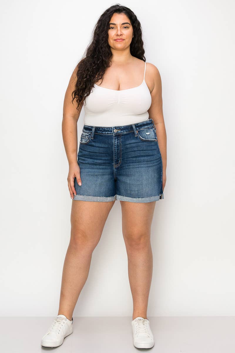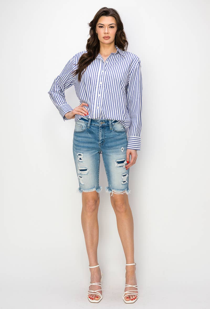 Bermuda in denim con vita alta e fascia larga all'ingrosso
