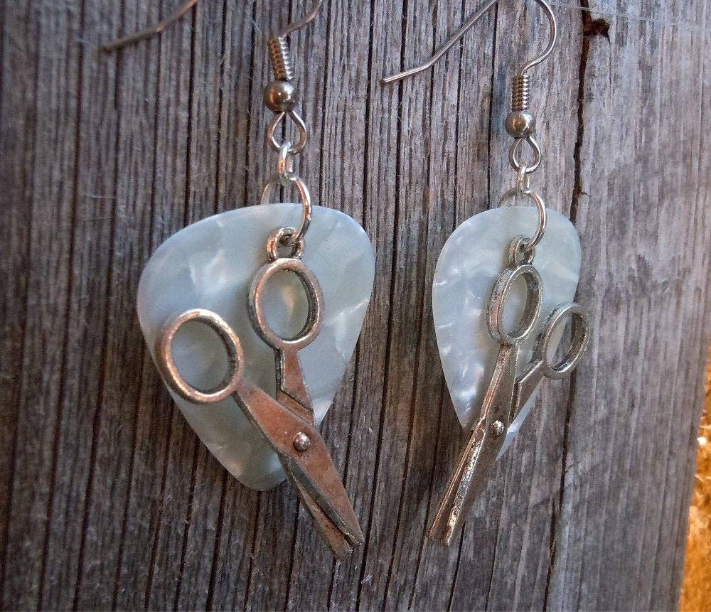 Questi sono realizzati con veri plettri per chitarra. Ciò significa che sul retro dei plettri per chitarra potrebbe essere stampato l'emblema dell'azienda produttrice di plettri. Ho usato anche ciondoli in metallo argentato in vetro da champagne. Sono lunghi 2,25 pollici dalla parte superiore della curva del filo auricolare alla parte inferiore dell'intero orecchino e sono dotati di auricolari in acciaio chirurgico (senza nichel, ipoallergenici). Per avere un'idea della lunghezza degli orecchini, inizia dal punto in cui l'orecchio è forato e misura verso il basso. Tutti i miei gioielli e accessori sono fatti a mano da me (Bethany) o da Jennifer. Prodotto e spedito da Lubbock, TX. USA