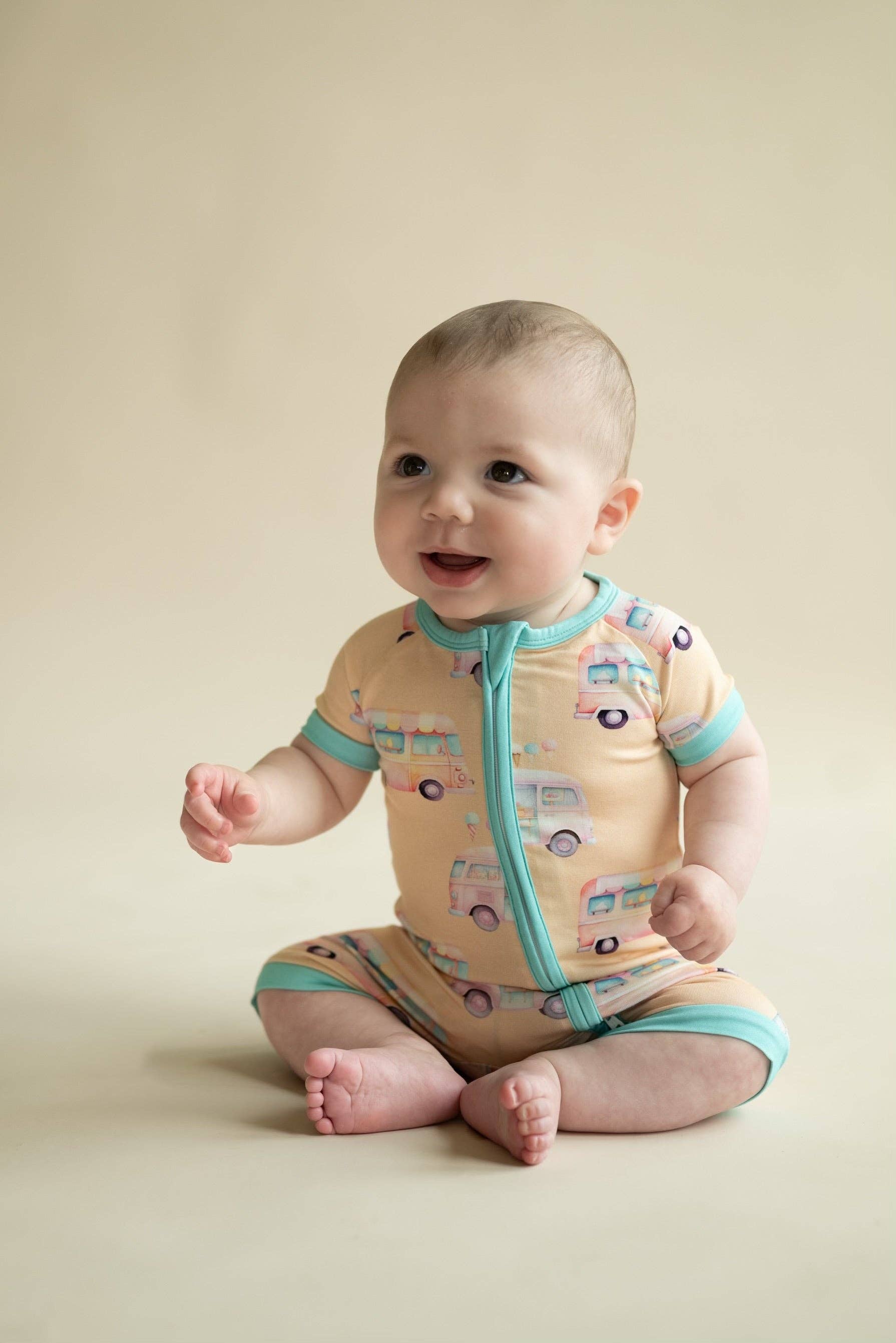 Resta alla moda per tutta l'estate con il nostro pagliaccetto corto nella stampa "Surf & Sand".