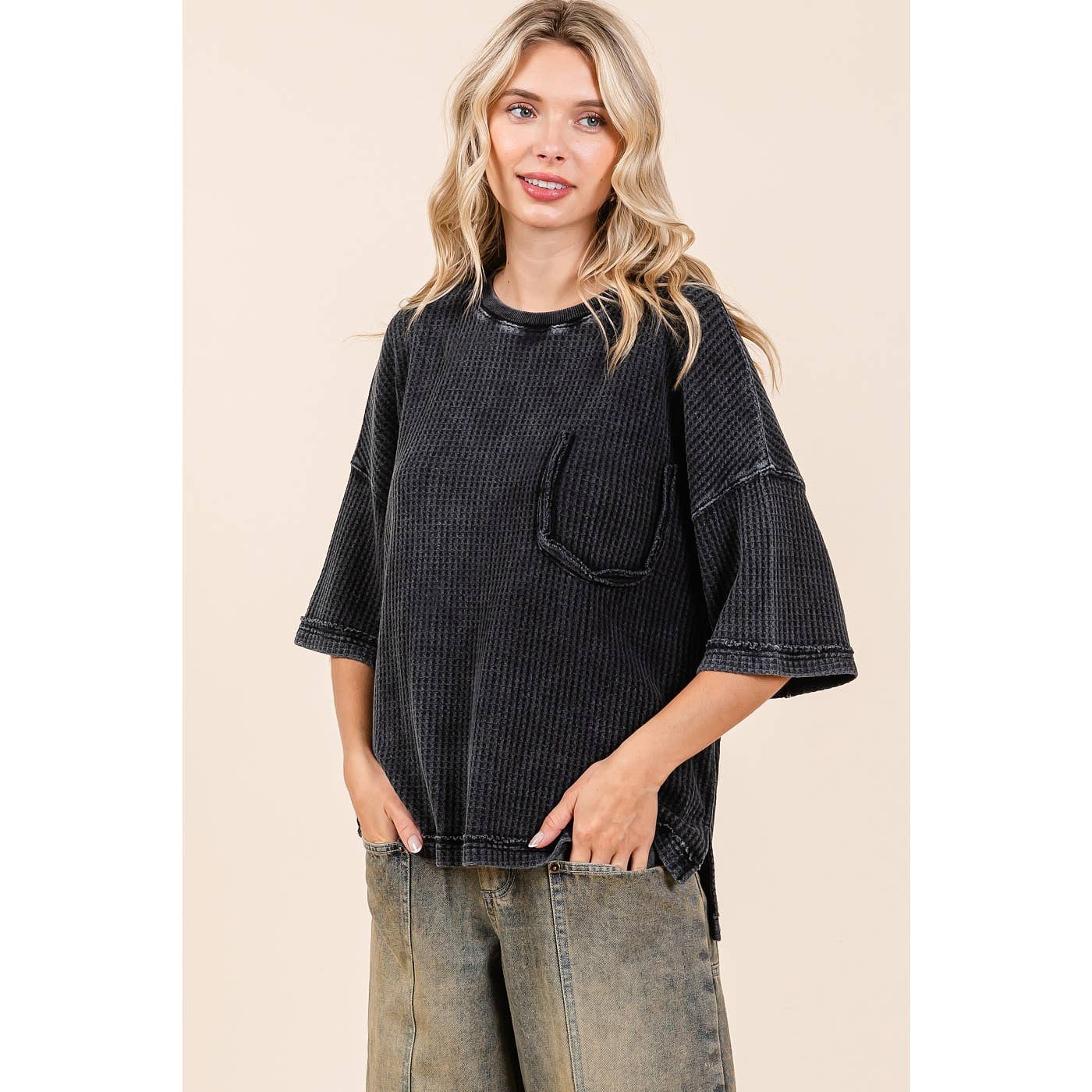 - TESSUTO A NIDO D'APE - LAVAGGIO MINERALE - CON COLLETTO - BOTTONI HENLEY SUL DAVANTI - TASCHE PIATTE FRONTALI - MANICHE LUNGHE CON POLSINO ABBOTTONATO - TESSUTO LAVATO A CONTRASTO SUL COLLETTO E SULLA PATTA DELLA TASCA - STILE PULLOVER - TOP DALLA VESTIBILITÀ OVERSIZE LA MODELLA È ALTA 1,75 CM E INDOSSA LA TAGLIA S # autunno, inverno, top, capispalla, abbigliamento esterno, giacca, camicia, pullover, lavato con minerali, colletto, abbottonato, tasca, vestibilità ampia, vestibilità comoda, boho, bohémien, vintage, western