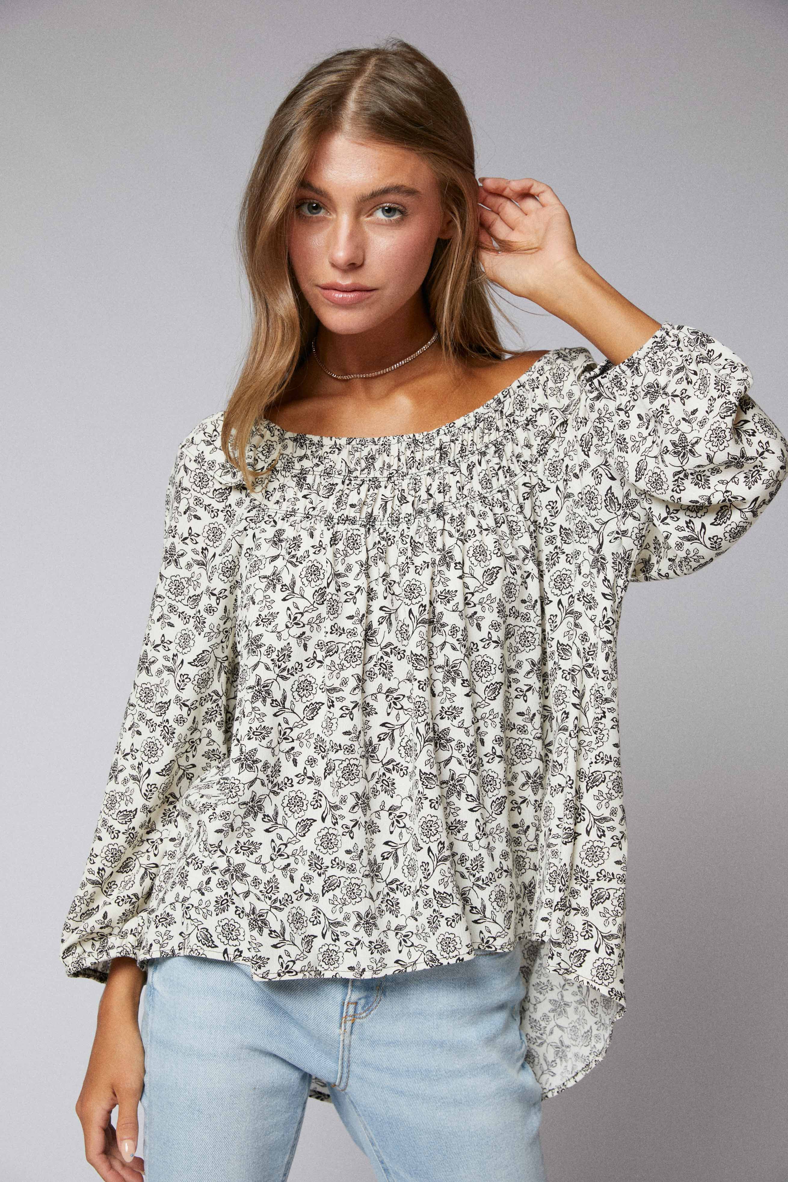 T1159-W008 - Top basso con maniche a 3/4 e ruches, stile contadino