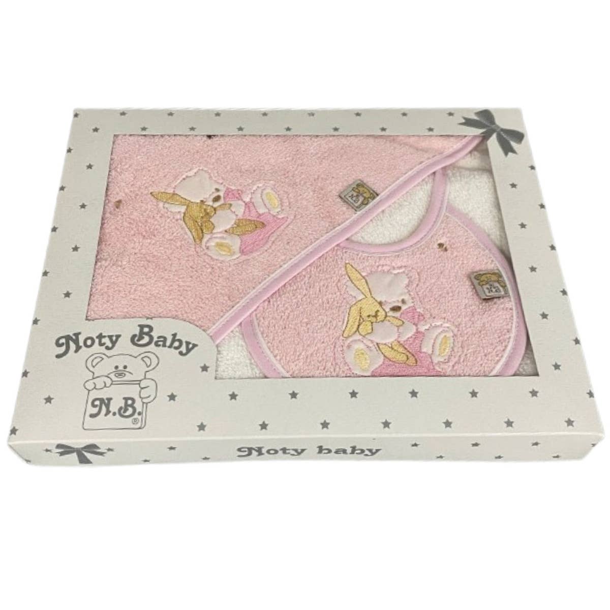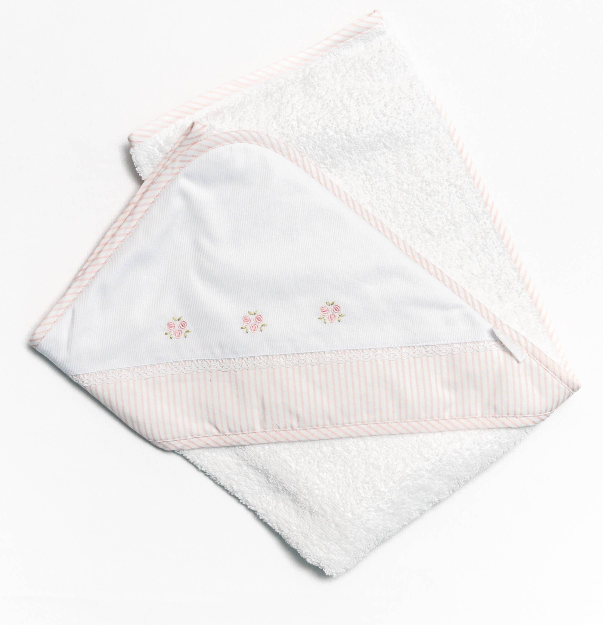 Asciugamano realizzato in tessuto spugna con cappuccio a bolle e rifinitura colorata. Disponibile nei colori blu, beige, grigio, rosa tenue, senape, rosa, verde e rosso. Misura 80 cm x 80 cm.