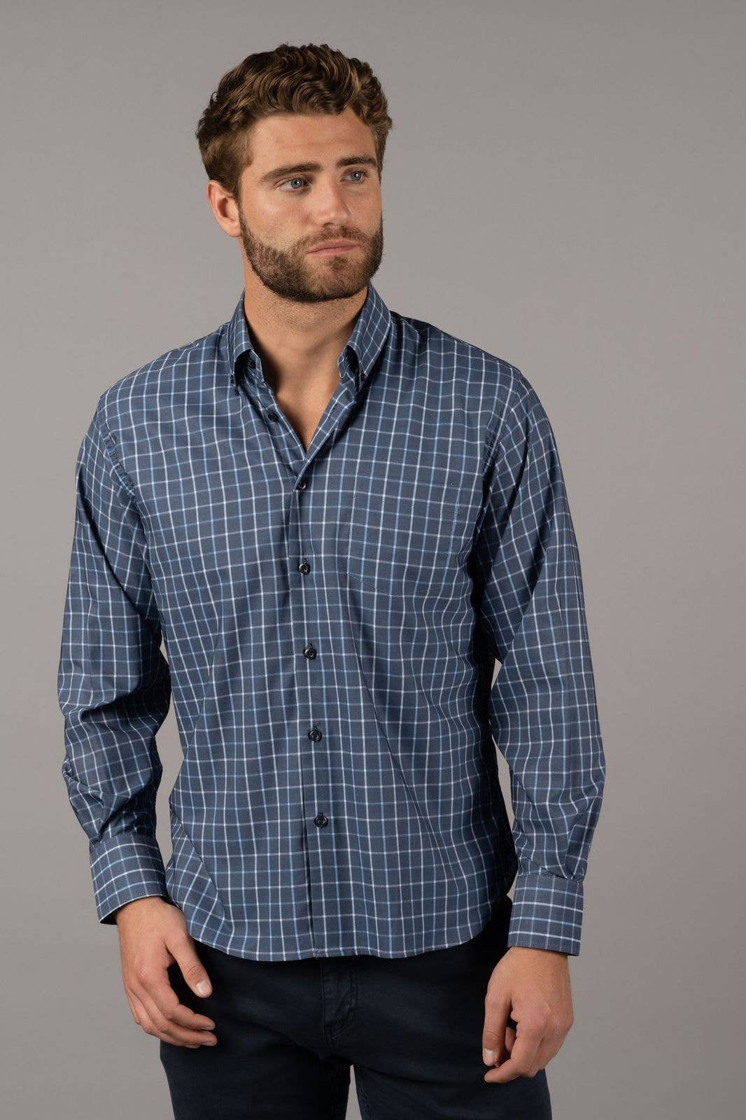 Camicia a maniche lunghe in blu con quadretti bianchi, blu scuro e arancioni. La camicia è elasticizzata in 6 direzioni e il materiale è 67% cotone, 30% modal e 3% elastina. CODICE: 46120