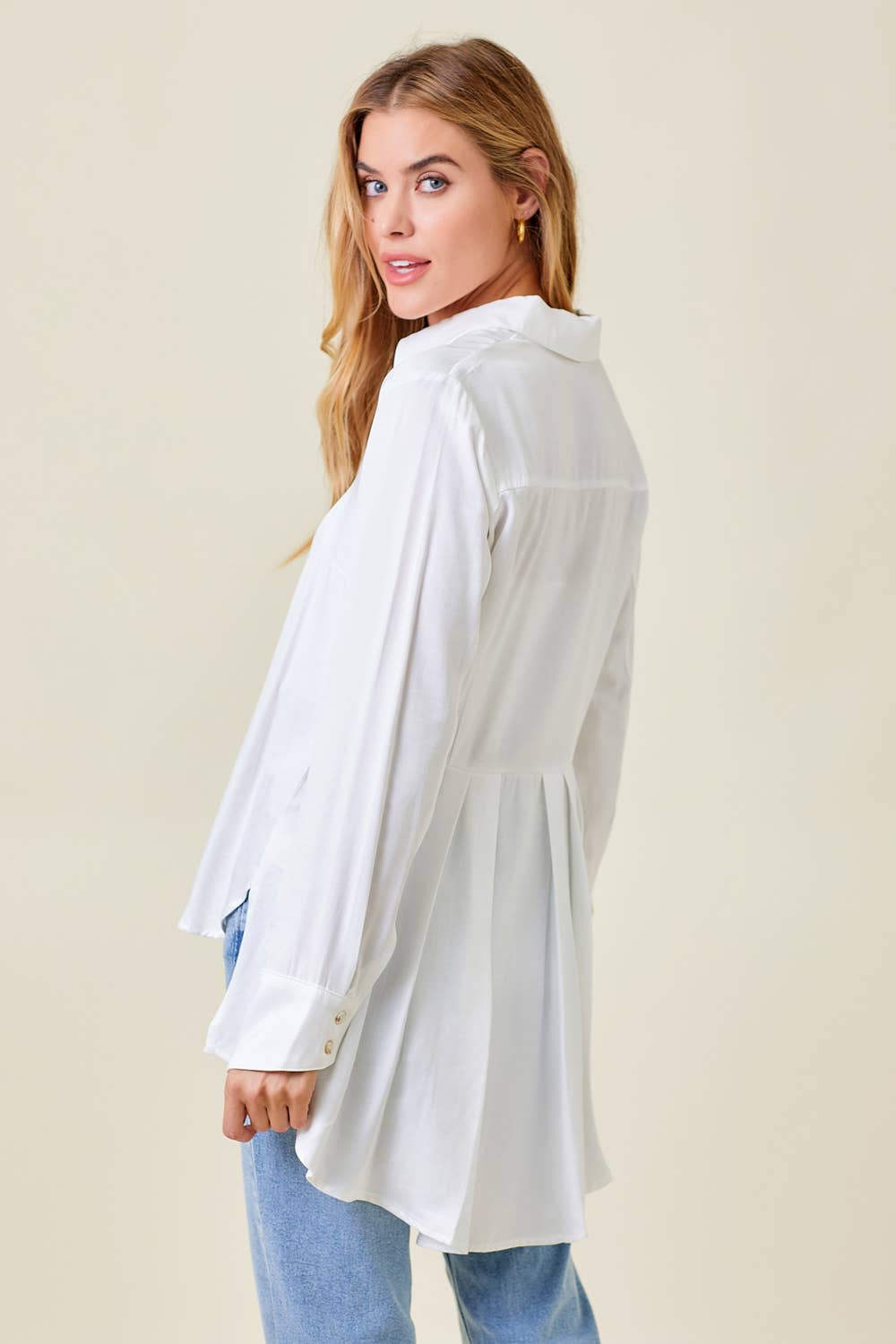 Camicia abbottonata con peplo sul retro Orlo hi-lo. Spacchi laterali Con colletto. La modella indossa una S/Altezza della modella: 5` 9".
