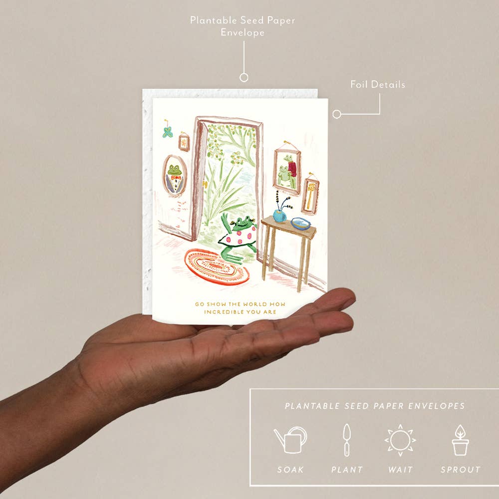 Tutti i biglietti d'auguri Seedlings hanno dettagli in lamina e una busta di carta seminabile che contiene semi di fiori selvatici. Questa carta seminabile è realizzata con una carta ecologica biodegradabile creata con materiali post-consumo - nessun albero è stato danneggiato per questa carta! Quando piantate, le nostre buste si compostano lasciando solo fiori. Vuoti all'interno, i nostri biglietti sono stampati su carta di alta qualità e sono tutti arricchiti con dettagli in lamina. Tutti i biglietti Seedlings sono realizzati negli Stati Uniti. Hai bisogno di un espositore? Ordina BOUDIS48 per un espositore girevole a 48 tasche o BOUDIS24 per il nostro espositore girevole a 24 tasche. Tutti i nostri biglietti sono disponibili anche senza cellophane. Contattaci se vuoi i tuoi biglietti senza protezione! Dimensioni del biglietto: 4,25" x 5,5" Busta: 4,3125" x 5,75" (A2)