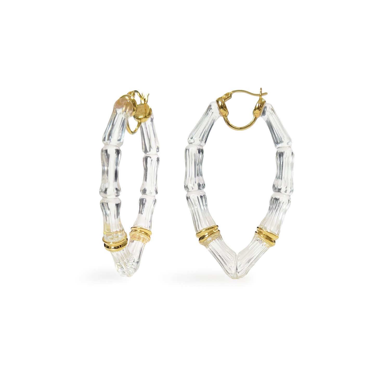 APPARSO NELLA RIVISTA COSMOPOLITA CON TIFFANY HADDISH! Si tratta di un'aggiunta di lusso alla nostra collezione di cerchi in bambù. Sono la regina di tutti gli orecchini in bambù. L'oro e la lucite si completano a vicenda per creare un cerchio elegante e chic. Il design audace li rende il più grande di tutti i nostri cerchi in bambù. C'est tres chic, oui!?! Cerchi in bambù da 2,75 «in colore oro e lucite lavorata a mano Taglia unica
