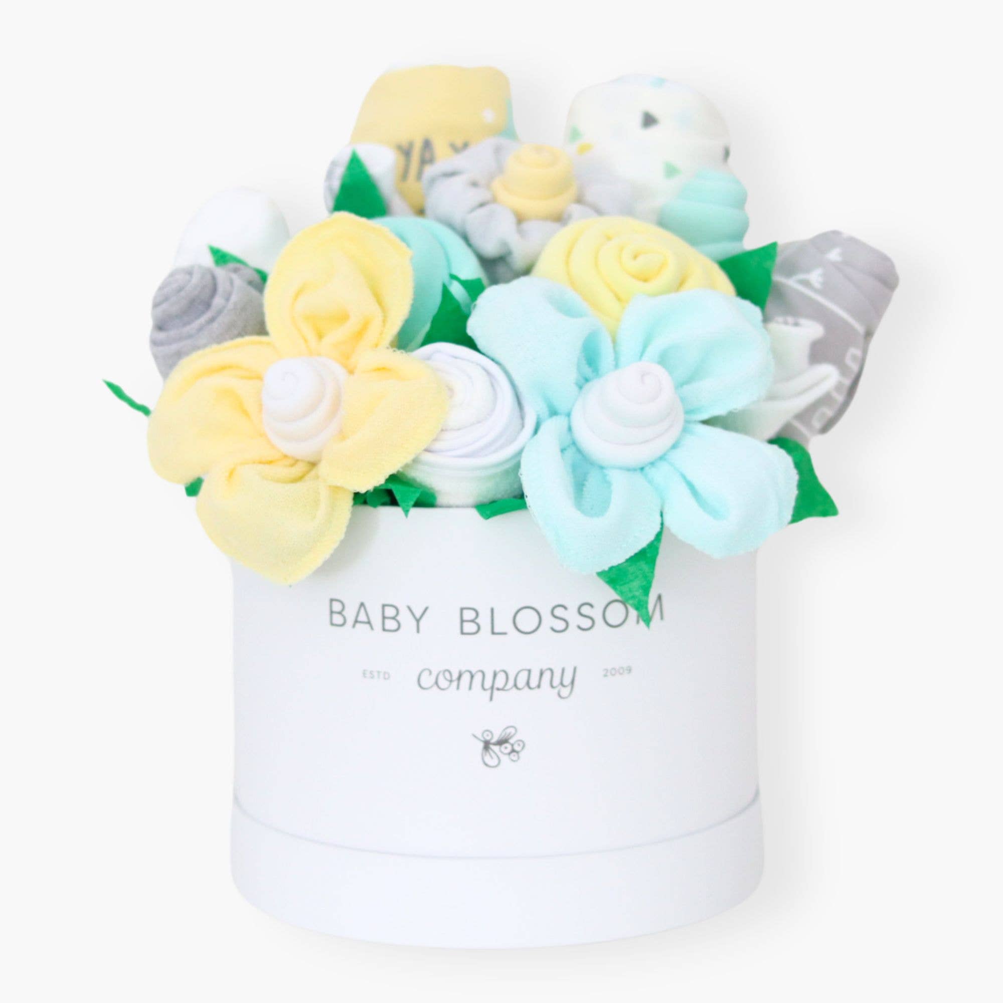 Festeggia la nuova mamma o la futura mamma nel miglior modo possibile con fiori pratici e adorabili! The Blooms: formato classico 3 tute 1 bavaglino 1 panno antirigurgito 2 pannolini usa e getta 3 paia di calzini 3 salviette L'abbigliamento è taglia 0-3 mesi. La disposizione si trova in una robusta scatola per ricordi in cartone del diametro di 15,2 cm. Il bouquet misura circa 20,3 cm di larghezza e 20,3 cm di altezza. Tutti i bouquet sono fatti a mano, quindi si prega di consentire lievi variazioni nelle misure. Il bouquet è avvolto in cellophane e legato con un fiocco coordinato. L'etichetta regalo è inclusa con spazio per un messaggio regalo e i dettagli del contenuto sul retro.