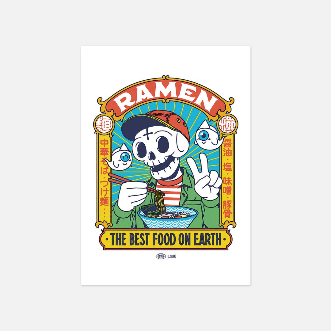 Questa illustrazione mostra uno dei nostri personaggi originali ispirati alla cultura e alle storie pop giapponesi, Yû, mentre mangia una ciotola di ramen. Yū è uno yûrei (fantasma giapponese), come indica il triangolo bianco che porta sulla fronte chiamato Hitaikakushi. Traduzioni: Ramen per sempre ₂ (zuruzuru) - onomatopea che si riferisce al rumore che i giapponesi fanno quando ingoiano una ciotola di ramen, equivalente a «slurp! Bevi!» Sì! Etichetta - Yeaaah! Studio • Cartolina in formato A6 (10,5 x 14,8 cm) • Carta Fedrigoni Arena 300gm2 certificata FSC • stampato in Francia