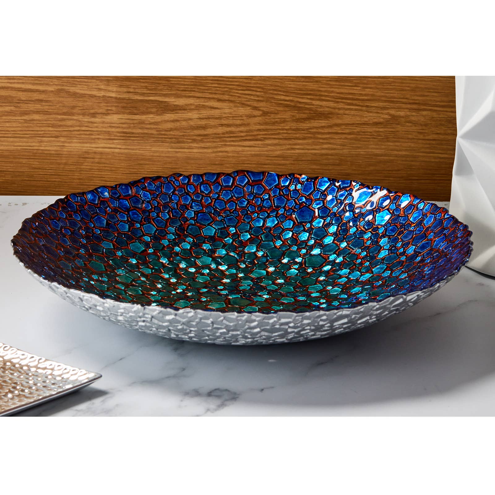 SKU: ASD10544MO Paese di produzione: Turchia Colore: Blu e Multicolore Materiale: Vetro Stagione: Tutto l'anno Stile: Moderno Tema: Mare e spiaggia Peso: 2,6 kg (5,73 lb) Dimensioni: 47 x 47 x 12 cm (18,5 x 18,5 x 4,7 in)