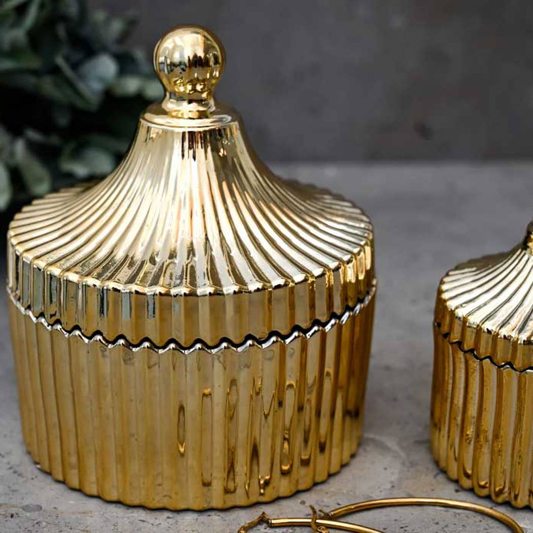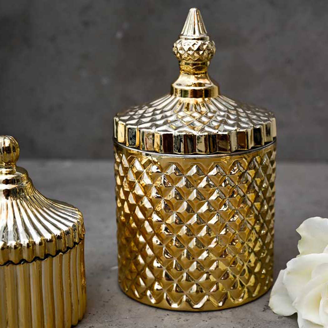 Come rendere le candele ancora più scintillanti? Mettili in uno dei nostri sontuosi portacandele Diamond! Realizzati in vetro con motivi diamantati e poi «cotti» con oro chiaro, questi eleganti portacandele diamantati daranno uno stile lussuoso a qualsiasi stanza. La loro finitura rifletterà le fiamme danzanti della candela e i motivi all'interno del vetro cattureranno meravigliosamente la luce. Disponibile nelle taglie medie e grandi.