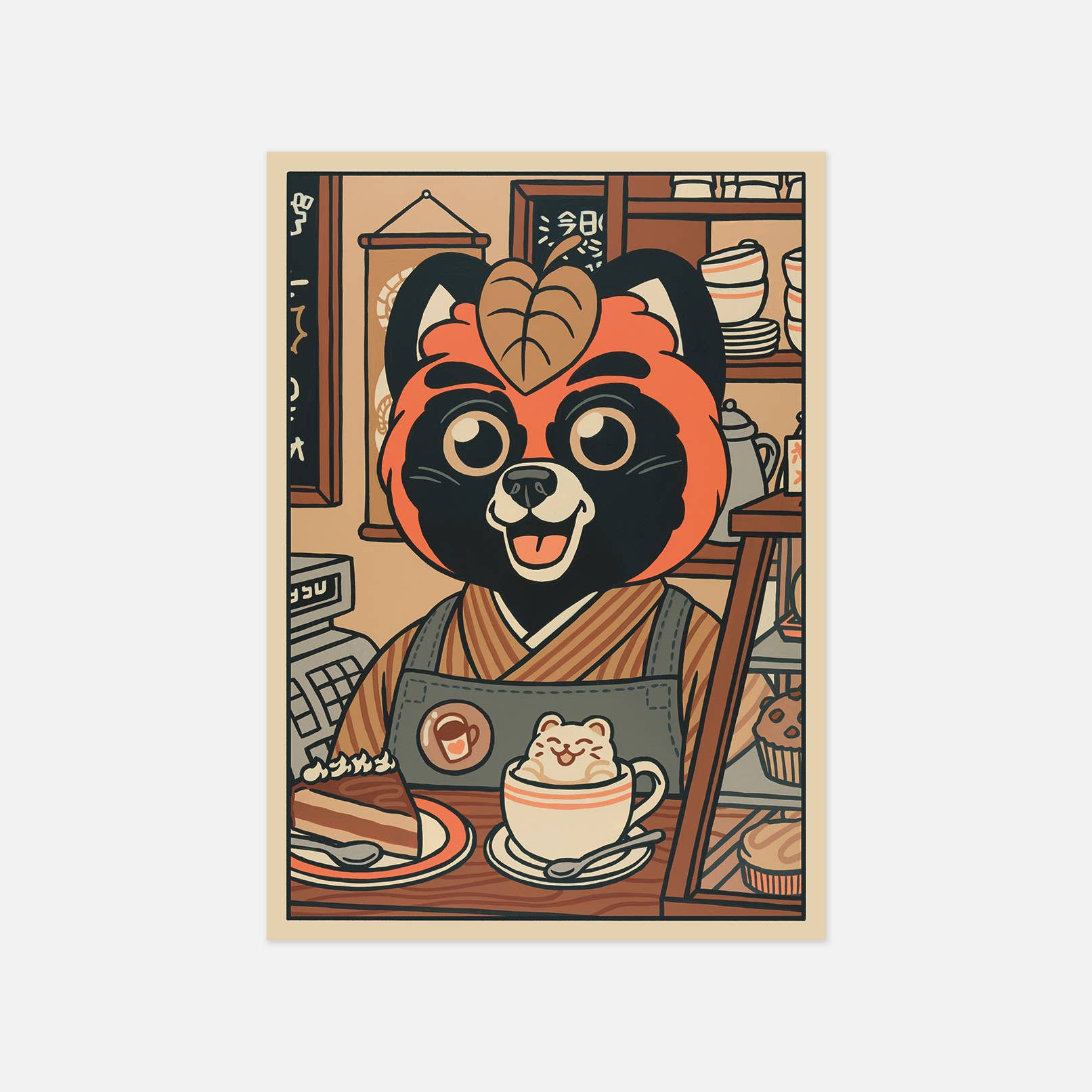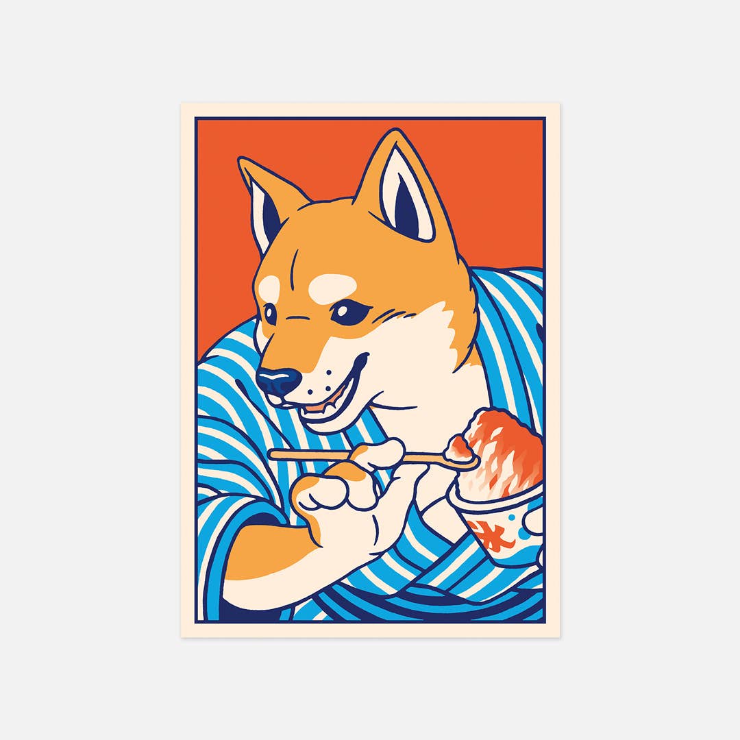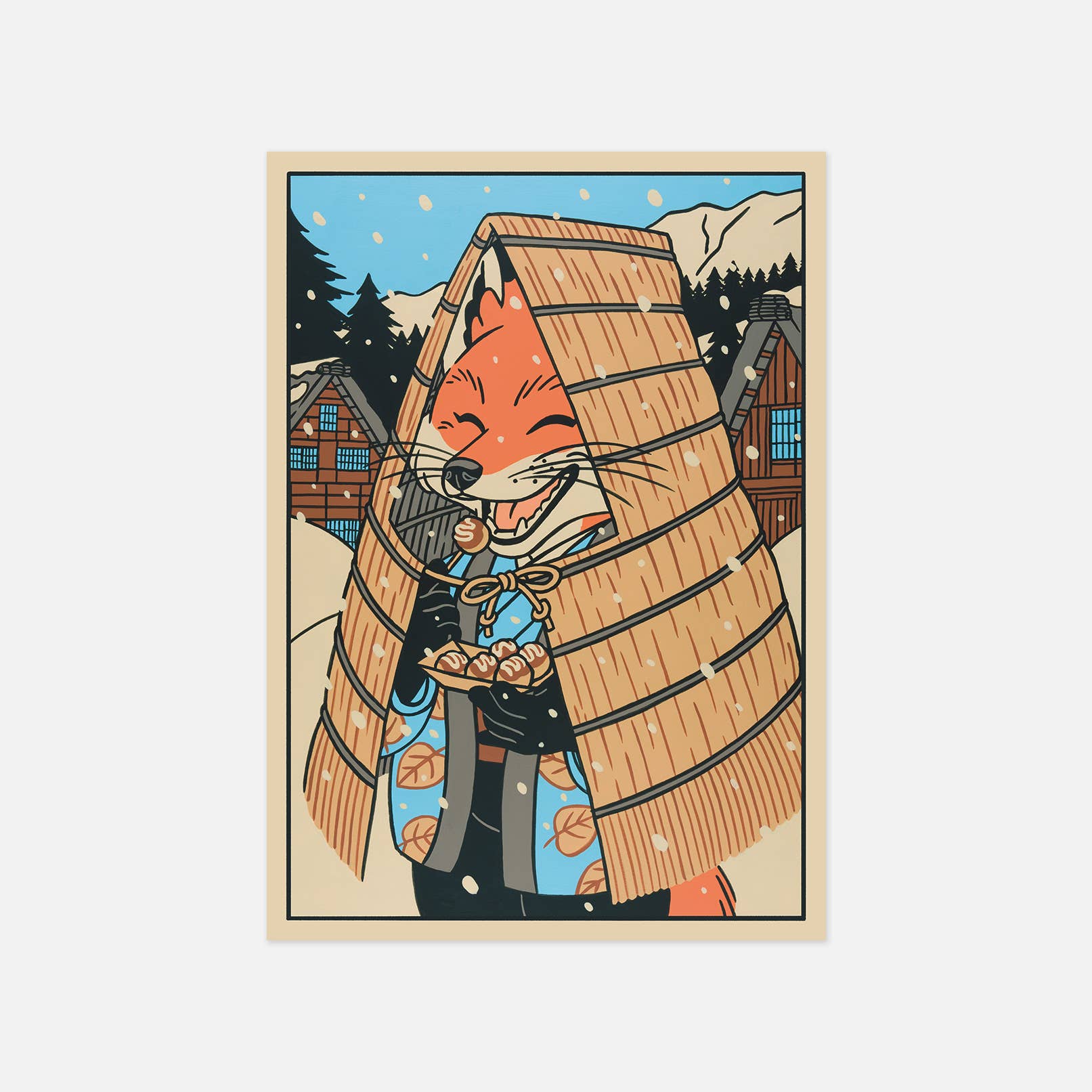 Questa illustrazione ispirata alla cultura giapponese rappresenta un gatto che esce da un ristorante sotto la neve. Indossa un cappotto di paglia di riso chiamato Mino, molto usato nelle campagne per proteggersi dalle intemperie. • Cartolina formato A6 (10,5 x 14,8 cm) • Carta certificata Fedrigoni Arena 300g/m2 FSC • stampato in Francia