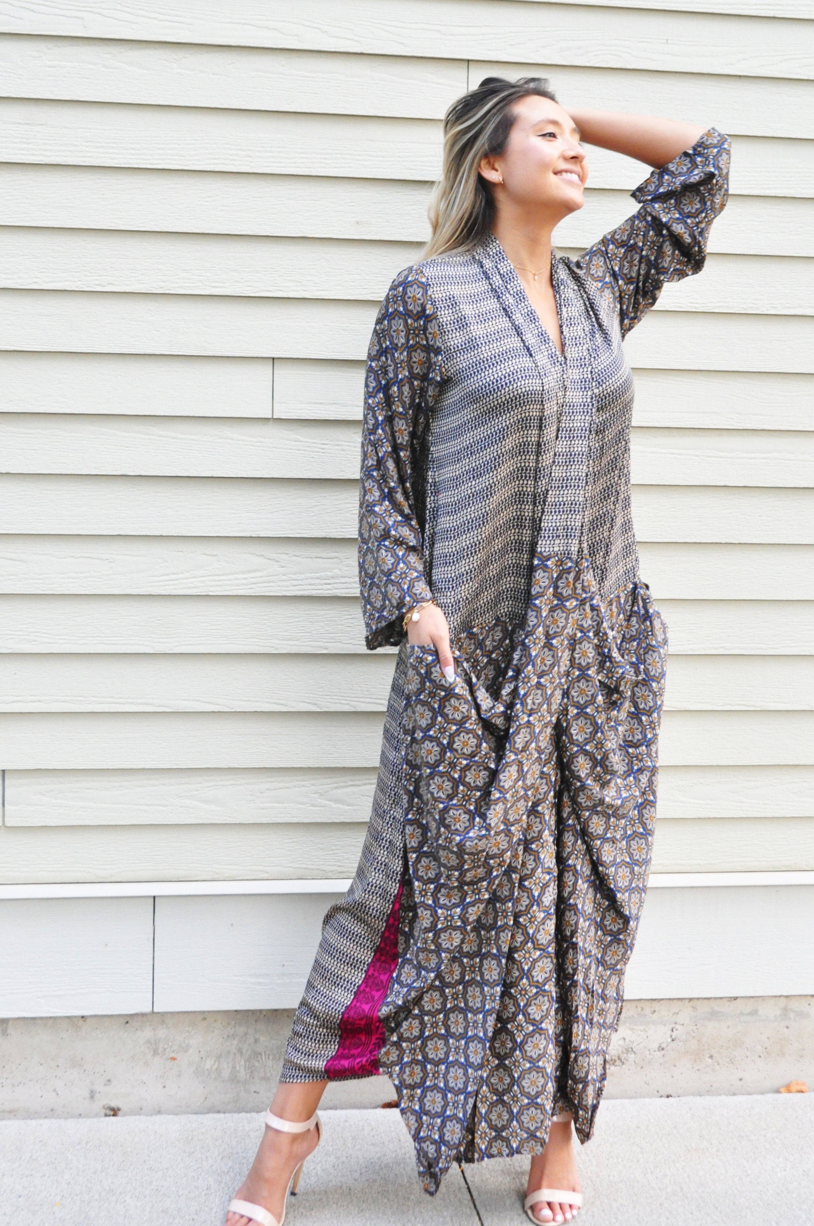 Stampa mista - Kimono con spalle cadenti stile robe con chiusura sul retro, tasche laterali e piccole fessure laterali. Completamente foderato. Tessuto: Sari unico nel suo genere Up-cycled I sari upcycled hanno una storia incredibile. Ognuno dei nostri sari Rasgulla di alta qualità viene raccolto barattando nei villaggi indiani e viene ridisegnato da Guru per te! I design di moda individuali sono creati per donne come te, che rispettano lo stile unico e il movimento della sostenibilità. Poiché i nostri sari hanno storia, possono avere anche piccole imperfezioni che sono mimetiche nella bellezza dei nostri squisiti sari. Questo tipo di difetti petite che abbraccerai, proprio come i nostri difetti personali. Perché niente e nessuno è perfetto.