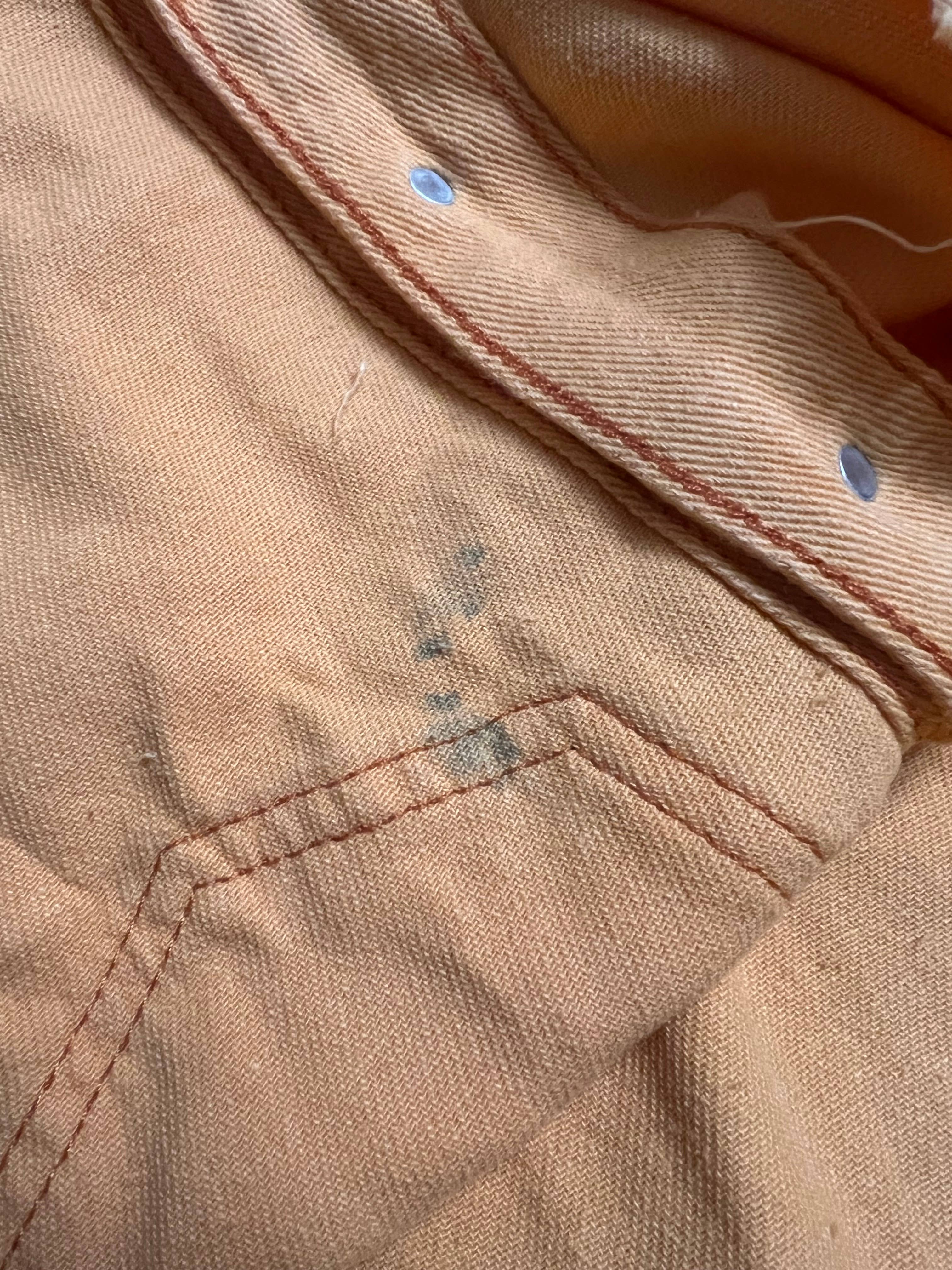 Giacca di jeans dal colore caramella con bottoni e tasche frontali, caratterizzata da bordi grezzi per uno stile casual e moderno. Tabella delle misure (cm): - S: Busto 116, Lunghezza 69, Manica 68 - M: Busto 121, Lunghezza 70, Manica 69 - L: Busto 126, Lunghezza 71, Manica 70 - XL: Busto 131, Lunghezza 72, Manica 71