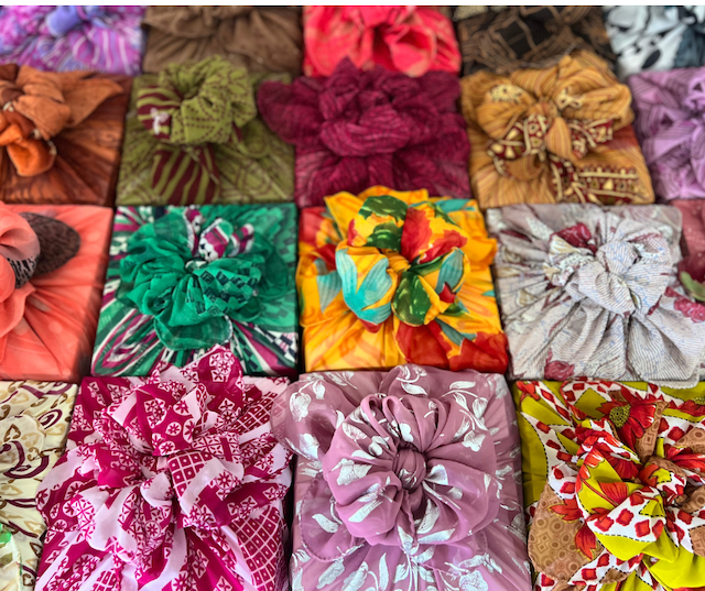 Il tessuto avvolgente è stato utilizzato in Asia per secoli come un'elegante tradizione, trasformando un regalo in un ricordo eccezionale. Questi involucri sono realizzati a mano con sari indiani riciclati. Ci sono diversi modi per avvolgere senza nastro con questi quadrati da 35", e la natura riciclata di questo prodotto significa che non ci sono 2 quadrati uguali. La bellezza dei tessuti indiani potrebbe persino ispirarti ad accessoriare con i quadrati come sciarpe o bandane! Per un avvolgimento di base: apri il tessuto a forma di diamante su una superficie piana. Posiziona il regalo al centro. Annoda i lati opposti con doppi nodi. Il tessuto si adatterà strettamente mentre i nodi formano un fiocco. Scopri di più sulle tecniche di avvolgimento e su questo prodotto. Dimensioni: 35" x 35". Tutta la collezione di Matr Boomie è fatta a mano, equo solidale e sostenibile. Realizzato da donne BEST SELLER!